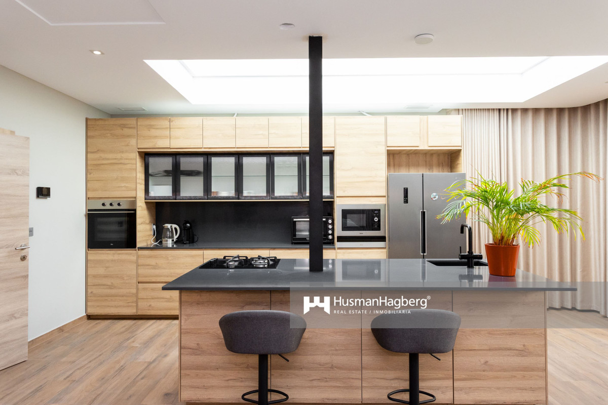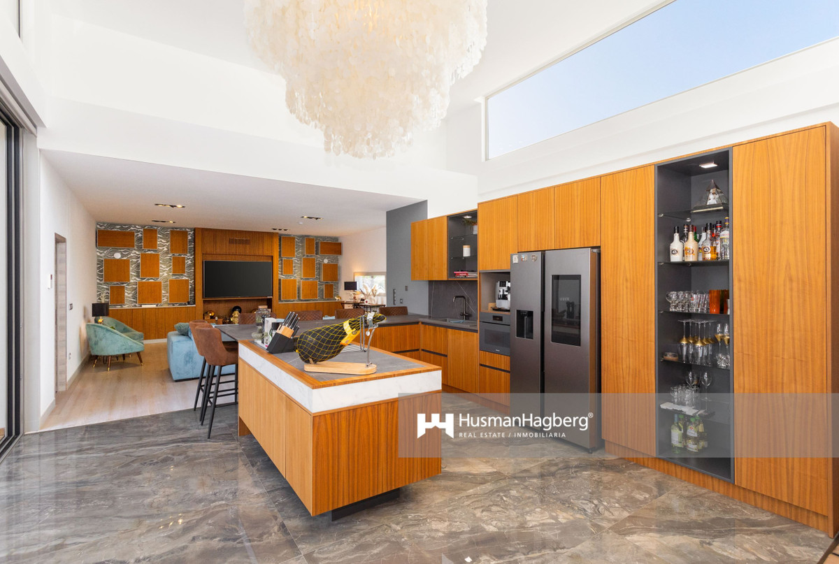 Villan färdigställdes 2021 och är belägen på en generös tomt om 477 kvadratmeter. Redan vid entrén möts du av ett mäktigt blickfång – en unik ljuskrona, handgjord av snäckor och importerad från Bali – som sätter tonen för resten av huset. Det stora vardagsrummet är öppet och luftigt, där ljuset flödar in från stora fönsterpartier och skapar en harmonisk känsla. Köket är fullt utrustat och inspirerar till både vardagsmatlagning och middagar i goda vänners lag.