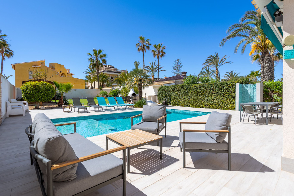 Välkommen till denna stilfulla och välplanerade villa med ett fantastiskt läge i hjärtat av eftertraktade Playa Flamenca på södra Costa Blanca – och bara 150 meter från att kunna lägga dig direkt på stranden!