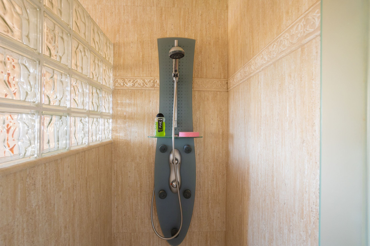 De två badrummen är stora, det ena badrummet är utrustat med toalett, dubbla handfat med kommod, dusch samt badkar medan det andra är utrustat med toalett, handfat och dusch.
