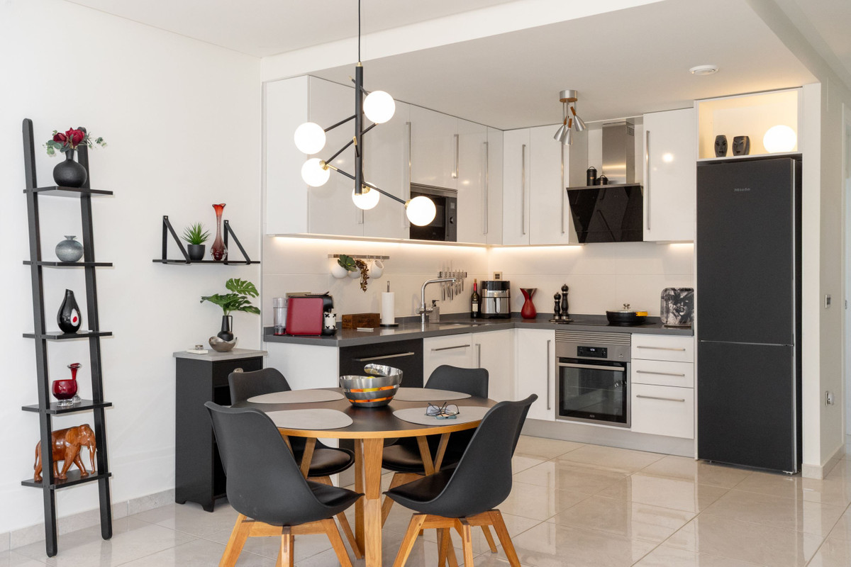 Köket har gott om arbetsytor och förvaring, stilrena ytskikt och ligger i anslutning till vardagsrummet, vilket gör det enkelt att umgås medan maten lagas.