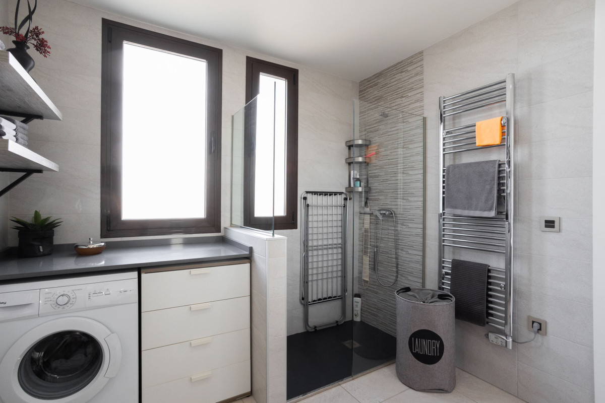 Radhuset har flera uteplatser: två i markplan, en balkong och en stor takterrass i soligt läge. Takterrassen är utrustad med både utekök och dusch, vilket gör den till en självklar plats för avkoppling, middagar och sociala stunder. Här finns gott om plats för loungemöbler, matgrupp och solstolar.