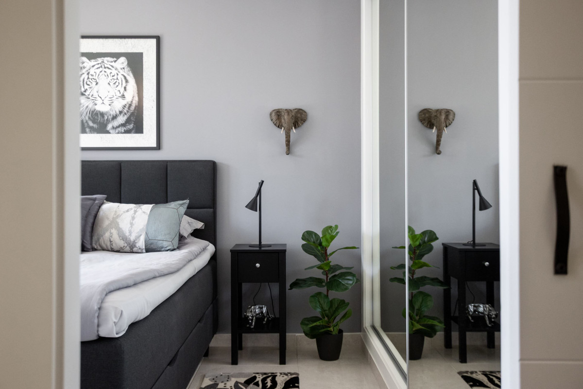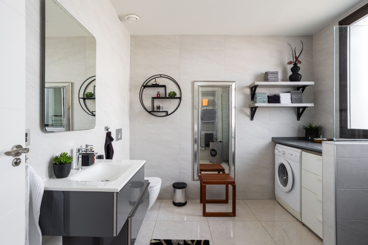 De två sovrummen är ljusa och rofyllda med platsbyggda garderober för bra förvaring. Ett av rummen används idag som arbetsrum men kan enkelt inredas som gästrum eller barnrum. Båda badrummen är helkaklade och utrustade med dusch, toalett och kommod.