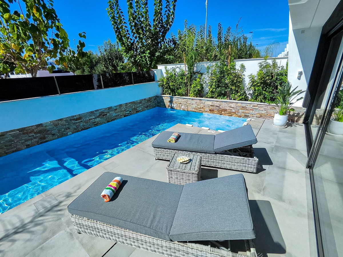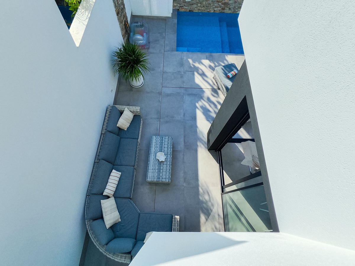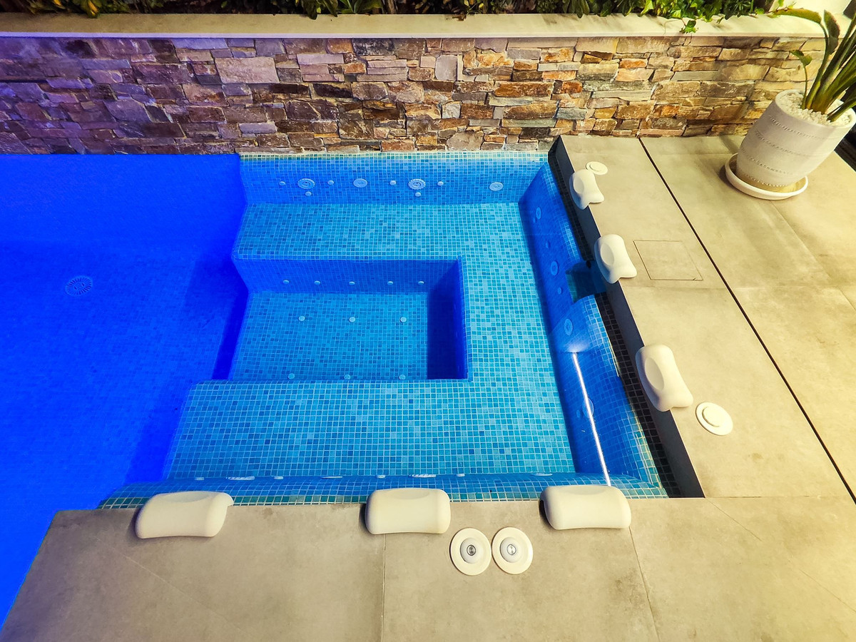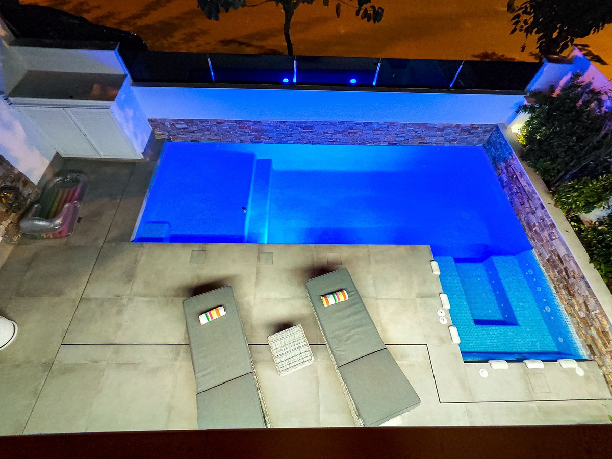 Utomhusmiljöerna är något alldeles extra. På den privata tomten om 97 kvm finns en stilfull pool för svalkande dopp, samt plats för avkoppling och middagar i solen. Högst upp väntar en generös takterrass – den perfekta platsen för solbad, loungehäng eller kvällar under stjärnhimlen.