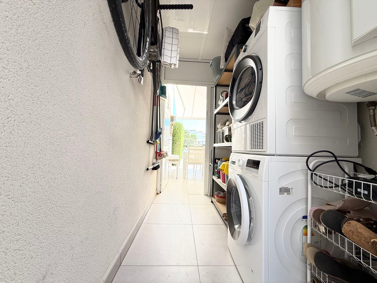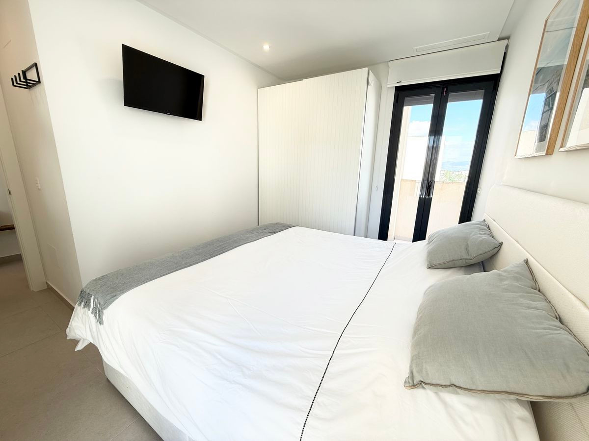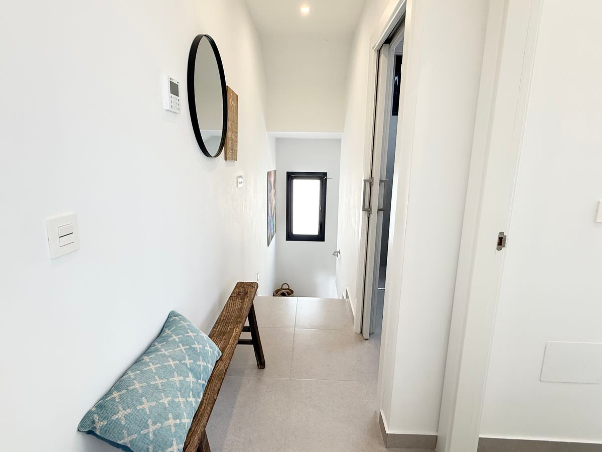 Inside, you will find a fully equipped Bosch kitchen, a bright lounge with electric louver blinds and vertical blinds, and ducted air conditioning for year-round comfort. The villa offers two spacious bedrooms, both located upstairs, each with floor-to-ceiling fitted wardrobes. The bedrooms share a modern bathroom with a walk-in shower, while a second bathroom with shower is conveniently situated on the ground floor. From one of the bedrooms, you can directly access the spacious 32 m² solarium — the perfect spot to relax or entertain while taking in the beautiful views.