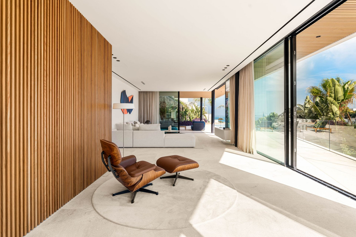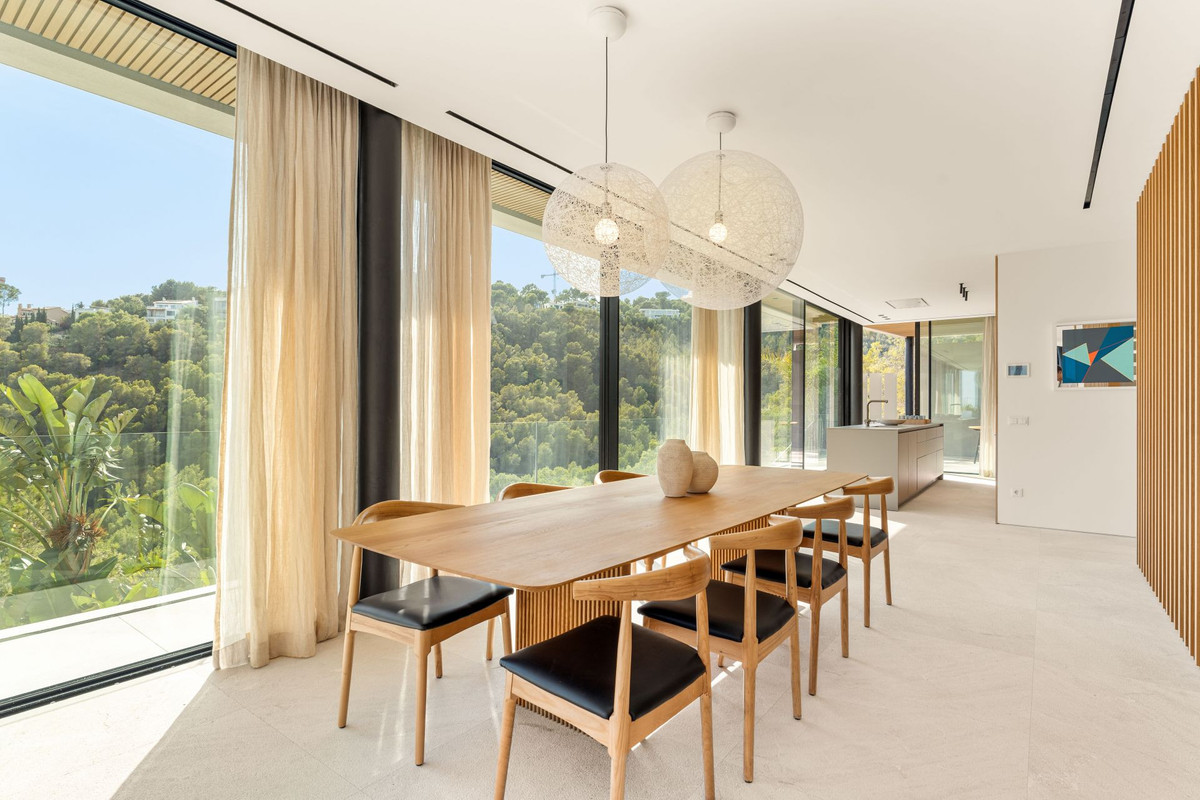 The design of Villa Zafiro balances sophistication and practicality. The ground floor is centered around a spacious open-plan living and dining area with direct access to a covered terrace and an infinity saltwater pool, creating seamless indoor-outdoor living. The kitchen is fitted with high-end Miele appliances and natural stone finishes, while expansive windows frame spectacular views.