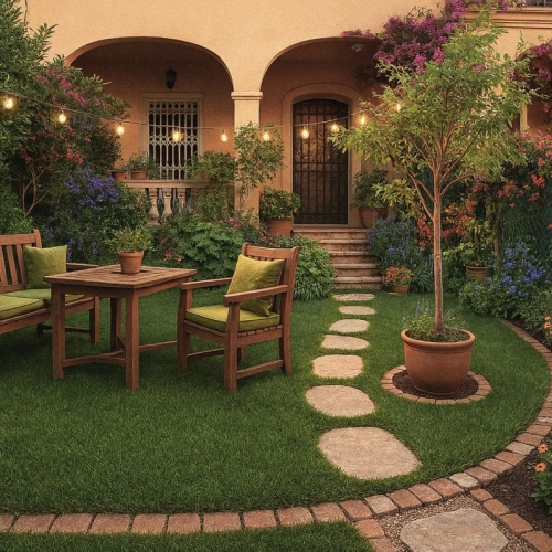 The private garden terrace offers both privacy and comfort – with a tiled, covered area enclosed by glass doors, a lovely lawn, and beautiful stone walls creating a serene ambiance.