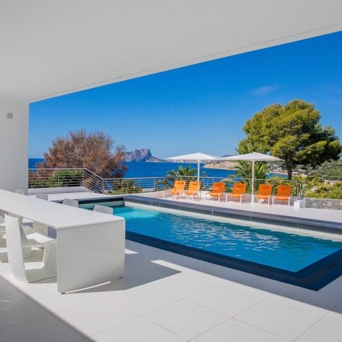 Dimmable lighting in floors and ceilings. Motorised sliding gate for vehicles and separate pedestrian gate. Parking space within the plot. A unique villa with an exclusive design and quality finishes, ideal for those seeking tranquillity, privacy and unparalleled sea views.