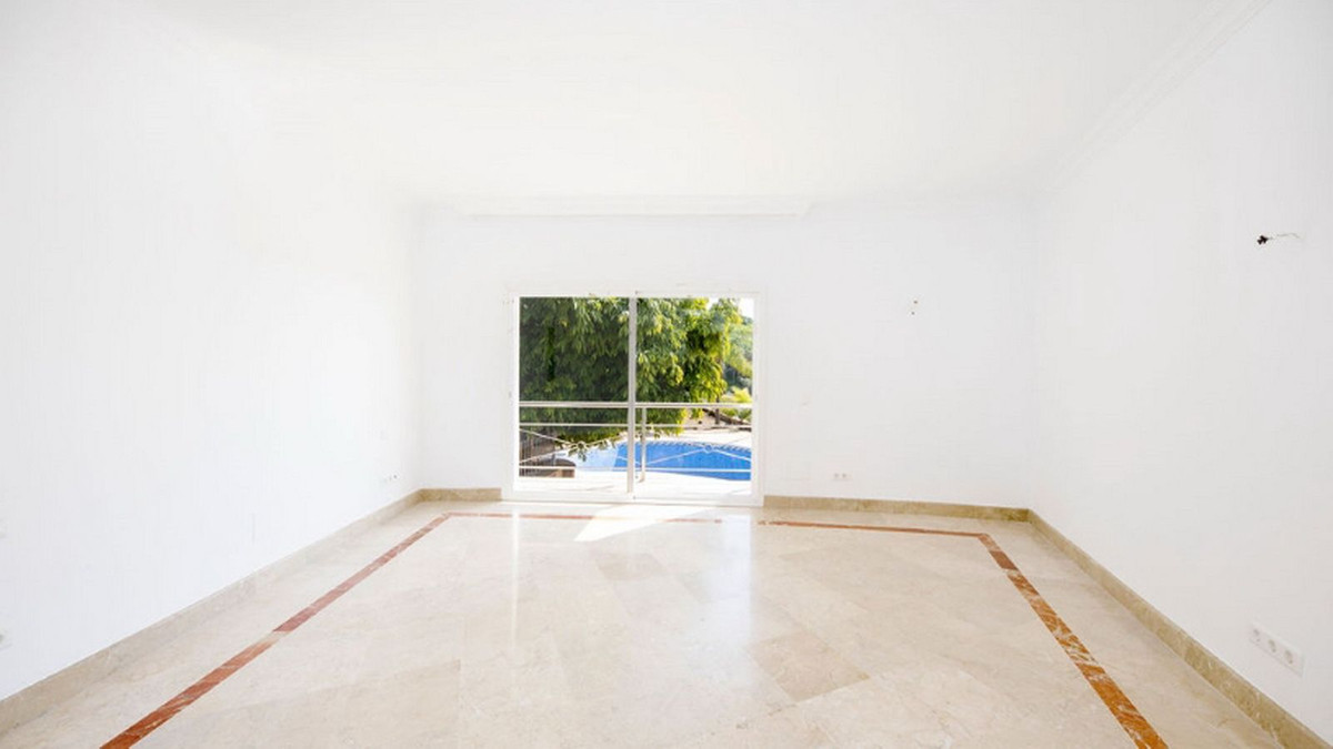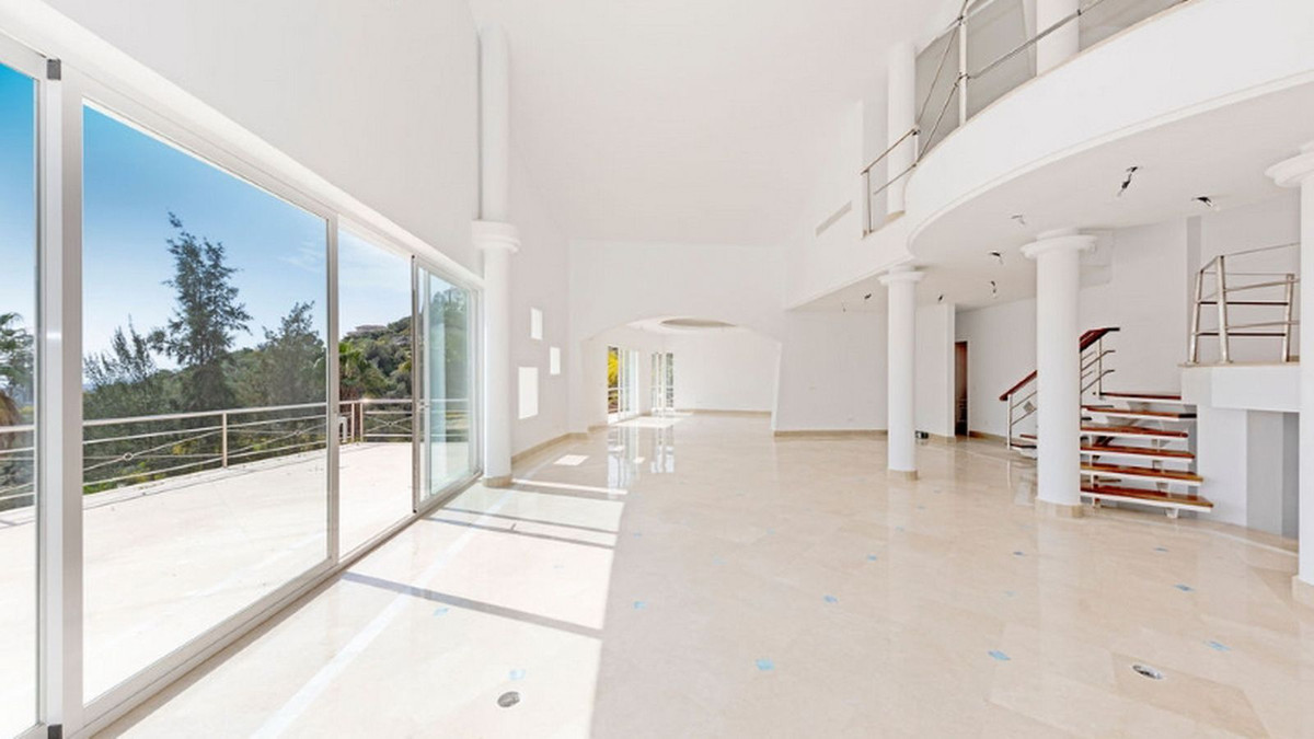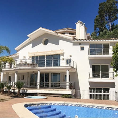 Detached house in the El Almendro Urbanization, Benahavís. It has a surface area of 1,383 m² distributed over 4 floors. The ground floor comprises a spacious living room, dining room, kitchen, access walkway to the hallway, 2 bedrooms with en-suite bathrooms, and 2 terraces. The upper floor, accessed from the street via the entrance porch, consists of an entrance hall, corridor, 1 bedroom with dressing room, 1 bathroom, and a terrace. The semi-basement level features a spacious garage with room for several vehicles, a games room, and two bedrooms with en-suite bathrooms. The basement level includes a bar area, dressing room, games room, and bathroom. The property sits on a 3,868 m² plot, which includes an entrance porch, parking area, and a large private garden with a swimming pool and jacuzzi, all with sea views. It comes equipped with built-in wardrobes, a fitted kitchen, a fireplace, and pre-installation for air conditioning. Located in a quiet residential area surrounded by several golf courses.