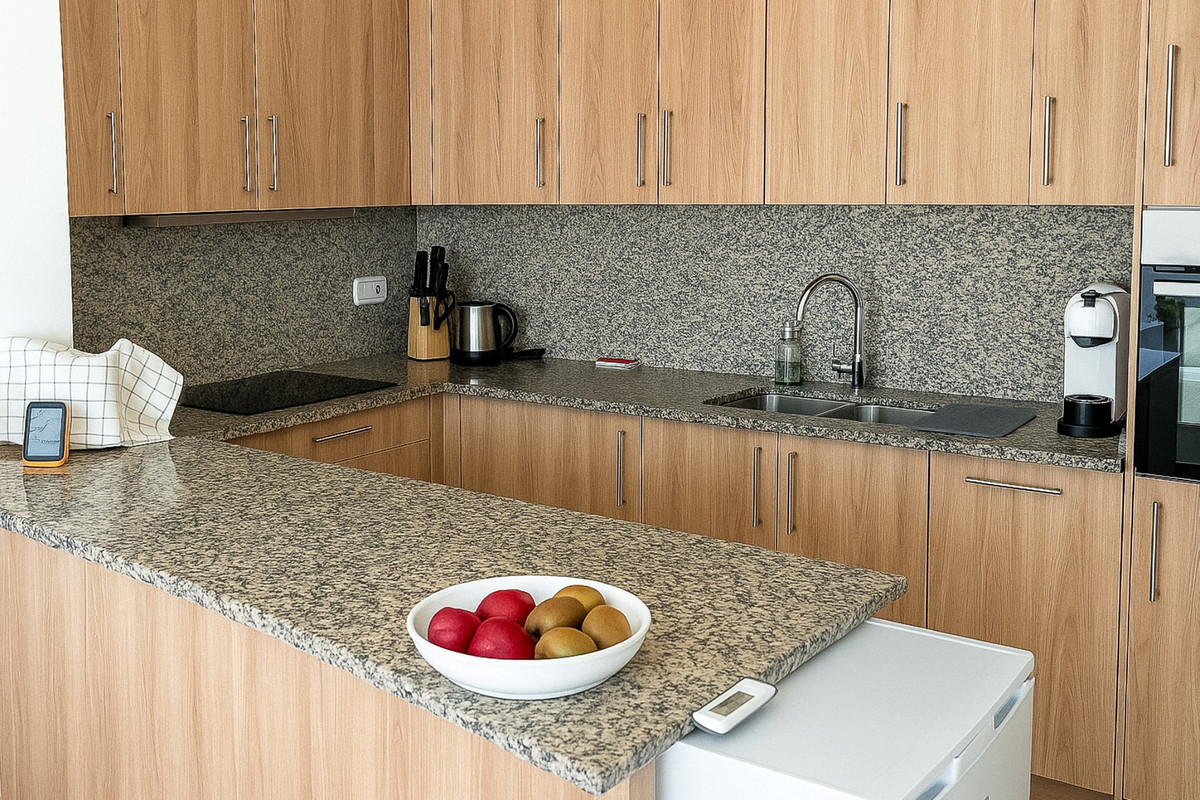 The main house features a spacious living and dining room , adjacent to a fully equipped open-plan kitchen with a dishwasher , oven , Siemens induction hob , and a large refrigerator . The kitchen has direct access to a large 150 m² terrace , ideal for enjoying the Mediterranean climate and the outdoors.\n