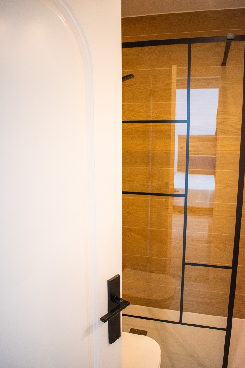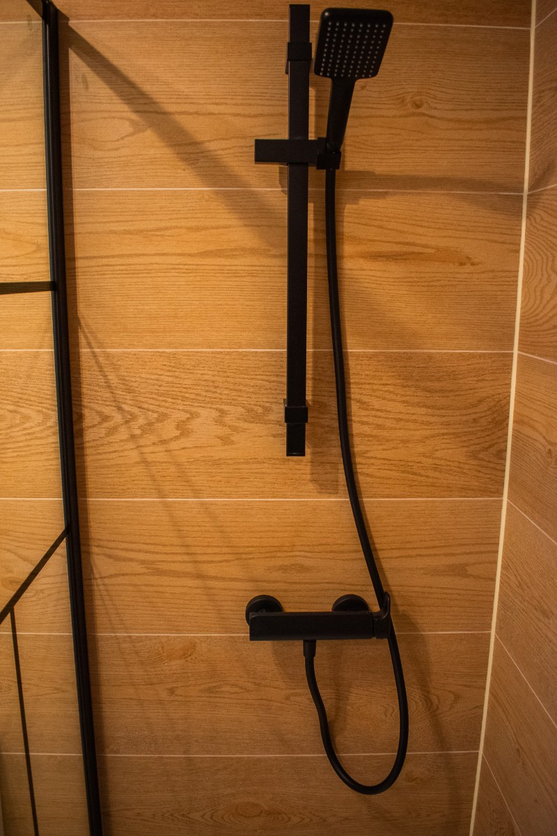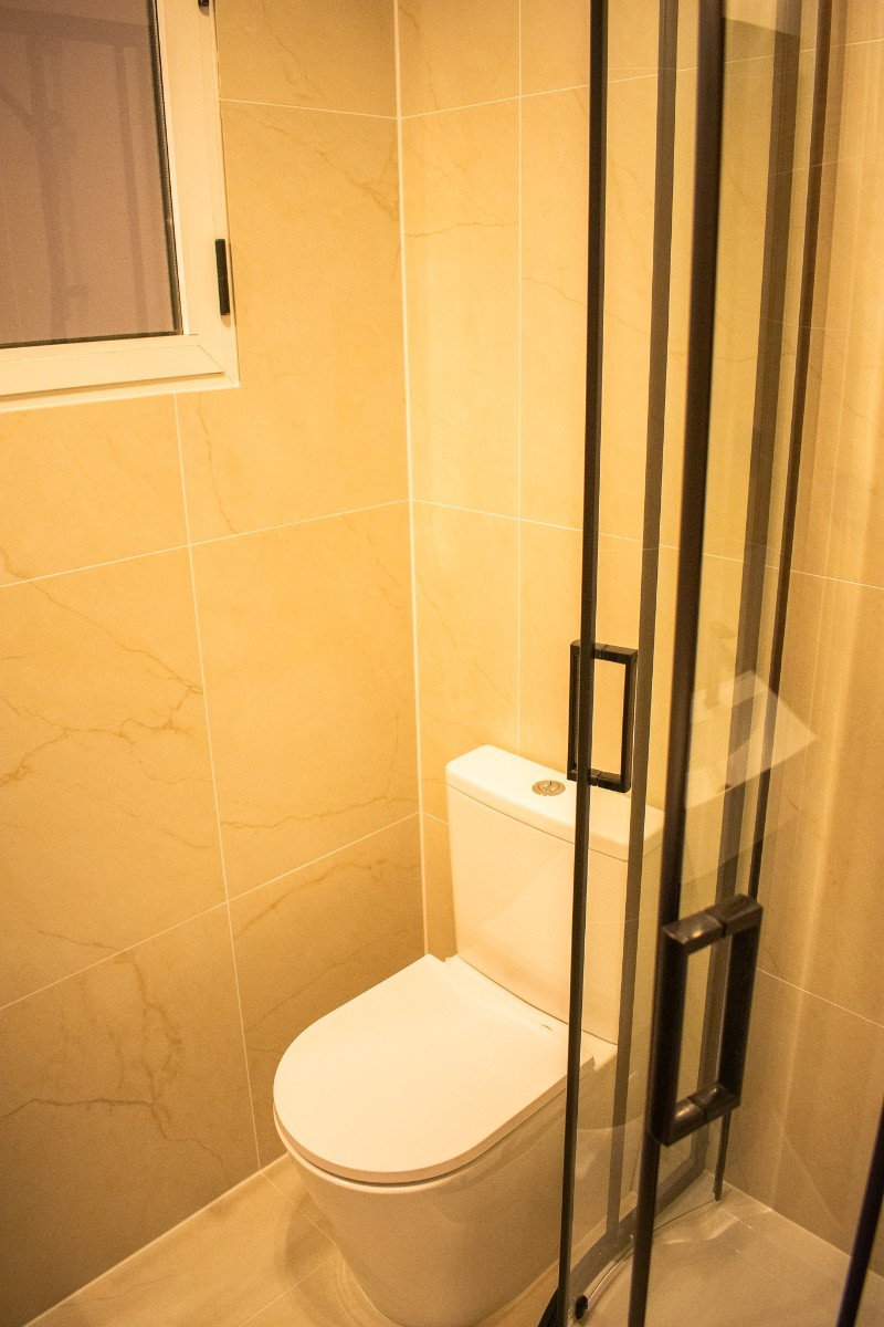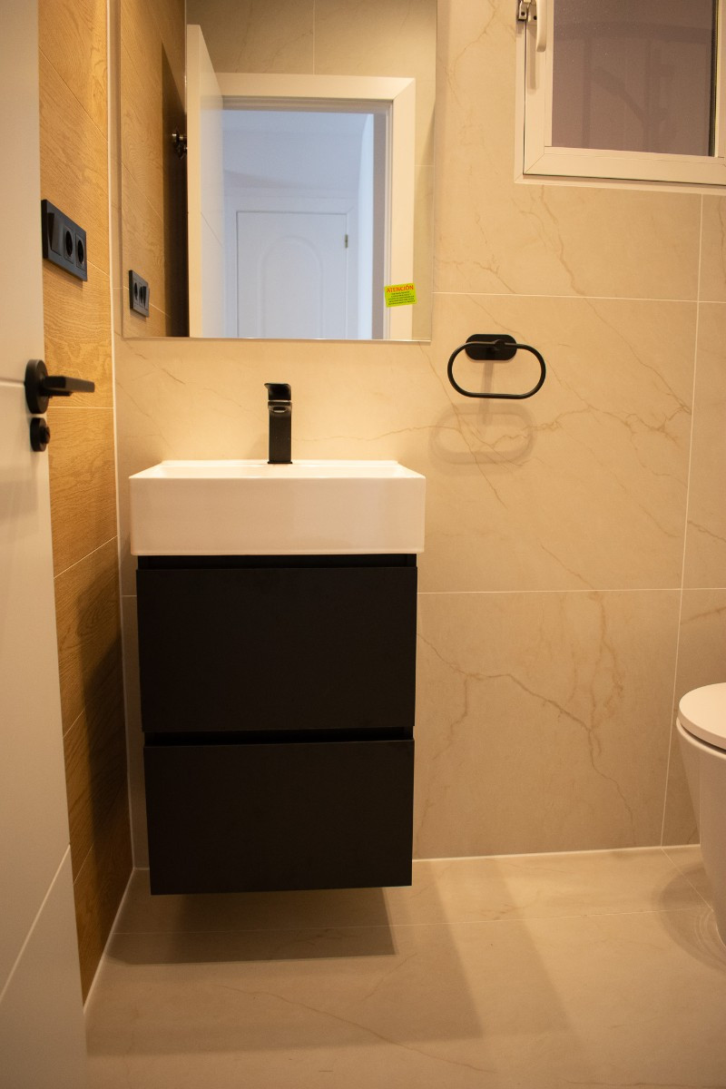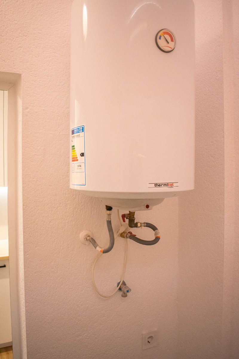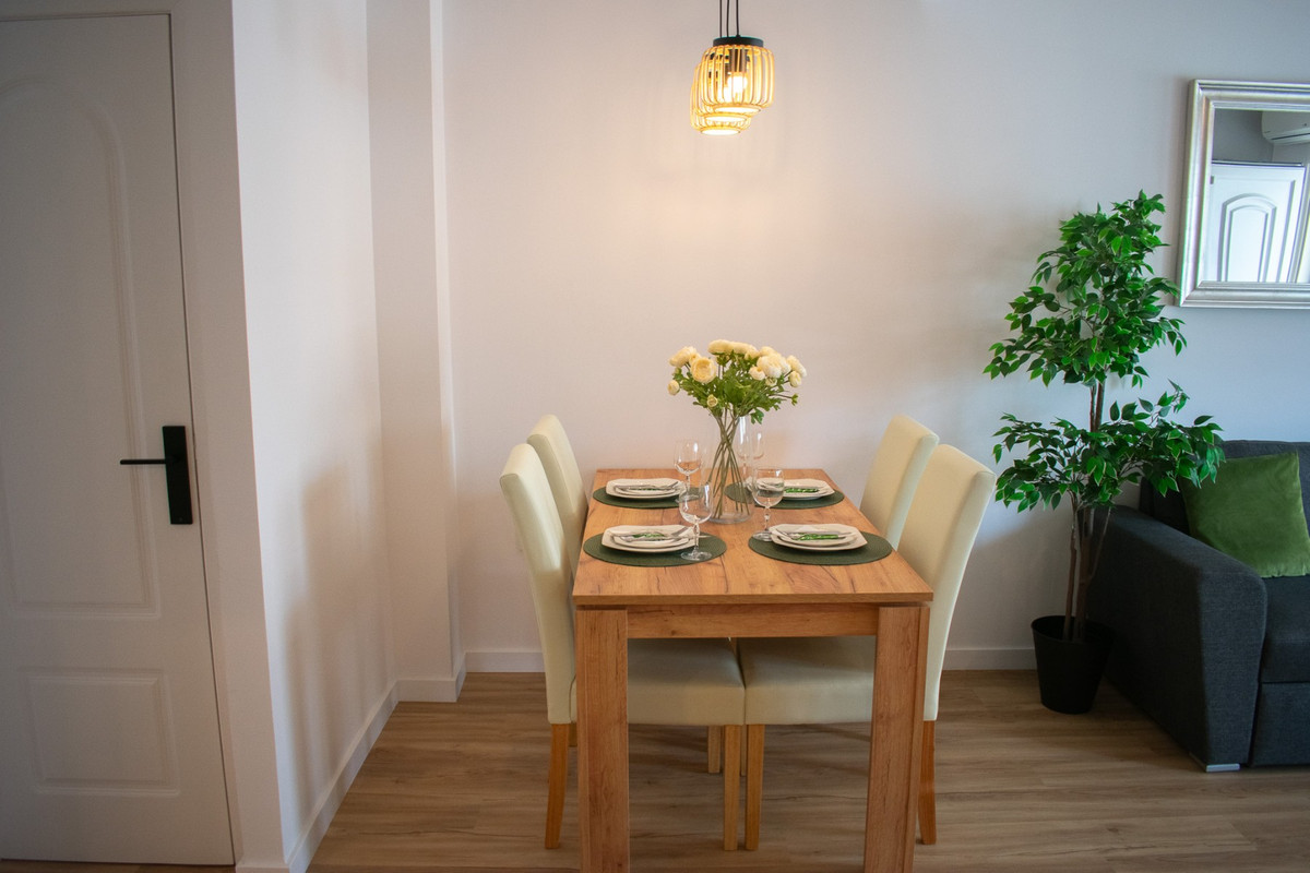 With three bedrooms (two upstairs and one downstairs) and two bathrooms, this townhouse offers functional and well-organized spaces. Downstairs, there is a spacious and comfortable living room with a sofa bed, air conditioning, and a large dining table . The modern kitchen is fully equipped with new appliances and ample cupboards . There is also a double bedroom , a bathroom with a modern shower , a utility room , and a storage room .\n