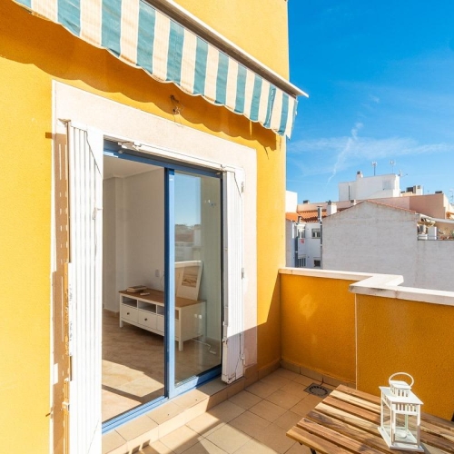 This duplex penthouse is located in Torre La Mata , just a 200-meter walk from La Mata beach , one of the most popular on the Costa Blanca . Situated on the third floor , the property offers partial sea views from both the solarium and the upper bedroom, guaranteeing a unique Mediterranean ambiance.\n