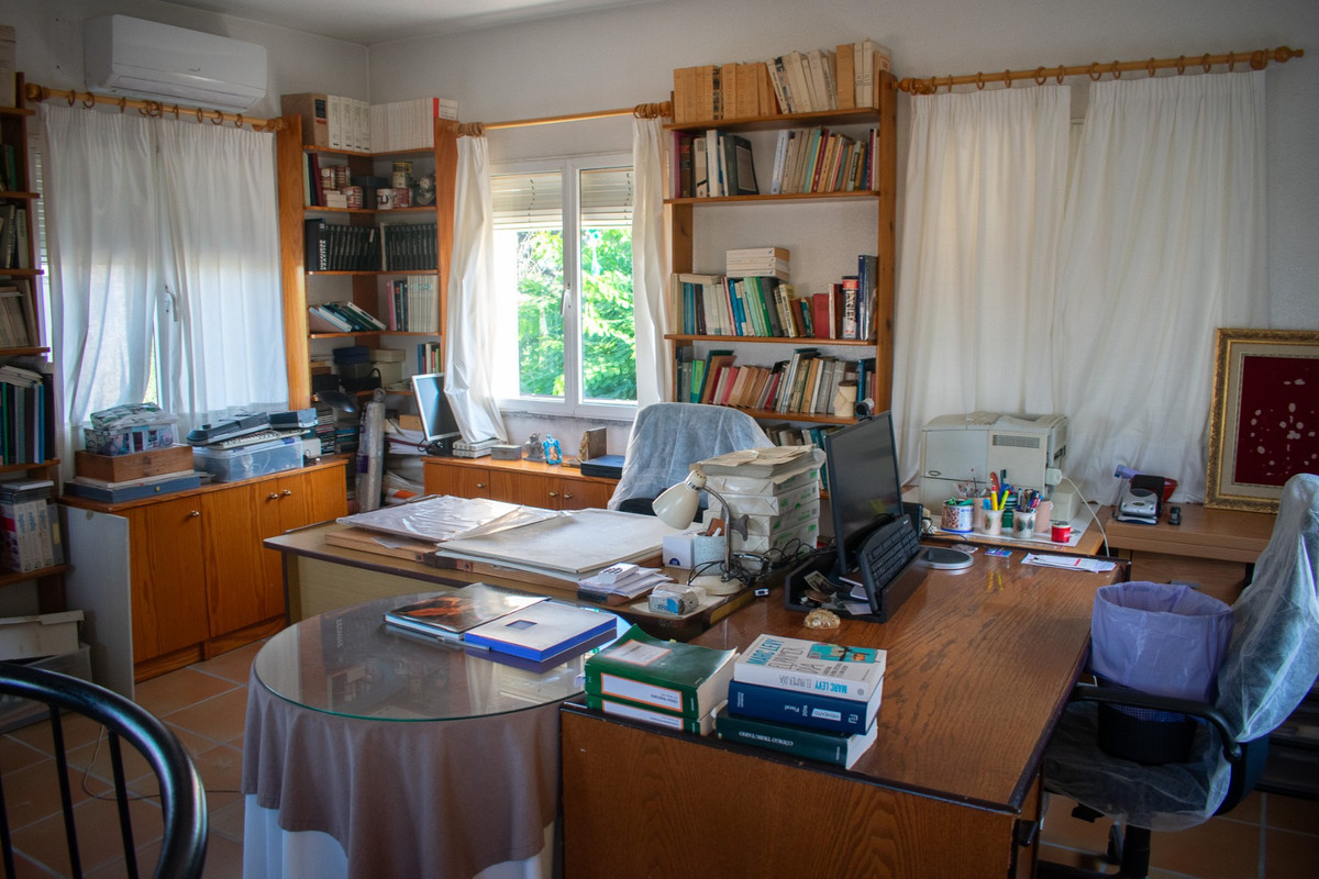 On the first floor , we find an open-plan attic currently used as an office , surrounded by panoramic windows that flood the space with natural light and offer views of the garden.\n