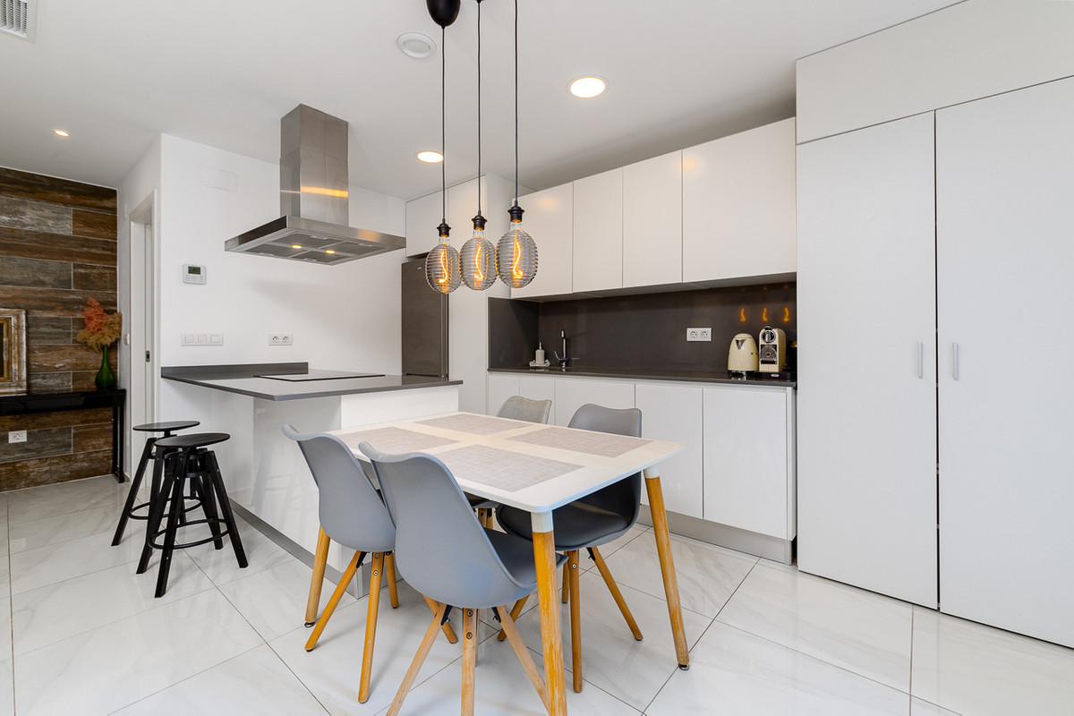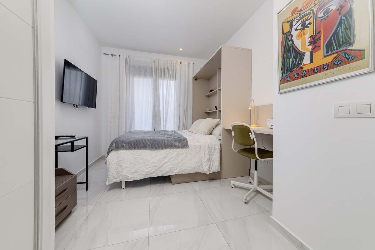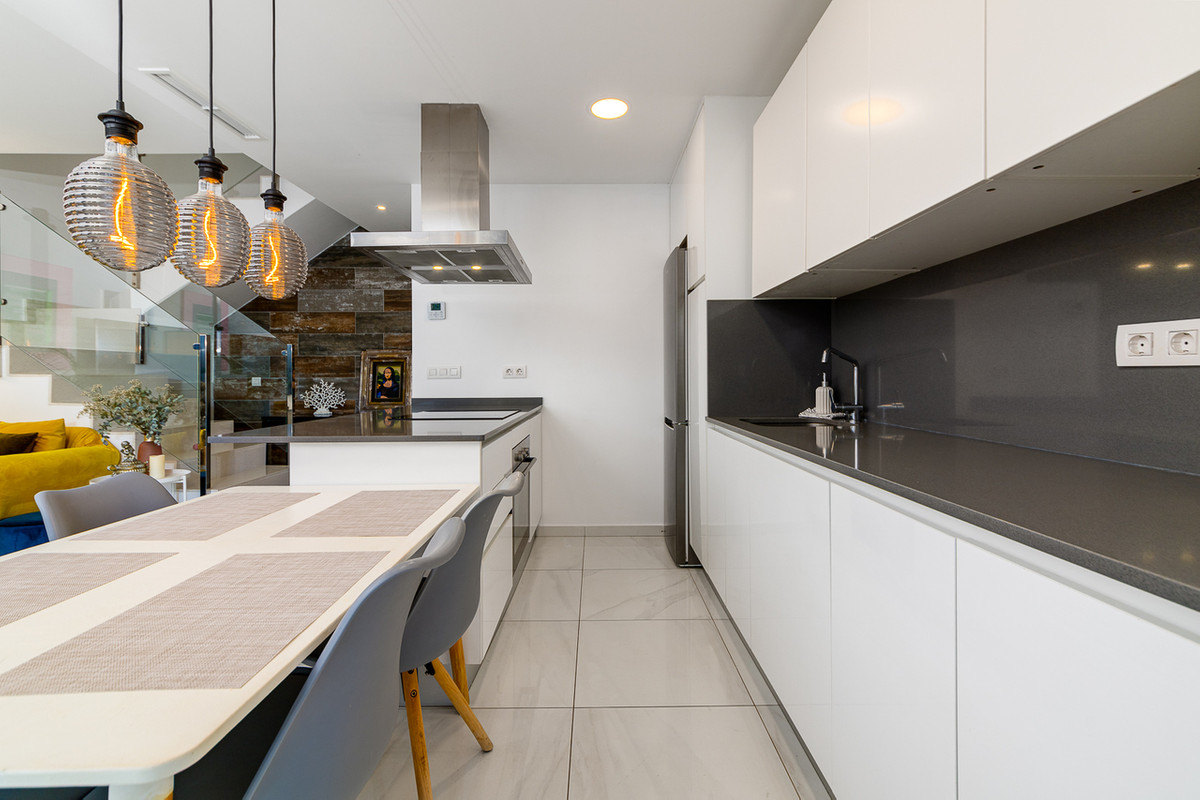 Bright and stylish home with 3 bedrooms, 3 bathrooms, open-plan living area, sunny terrace and private solarium. Sold fully furnished and ready to move in. Located in a quiet residential complex with a large communal pool and green areas — perfect for living or holidays on the Costa Blanca.