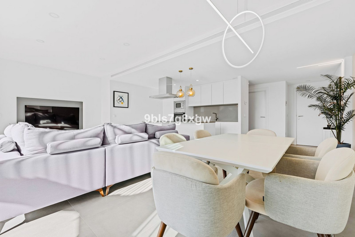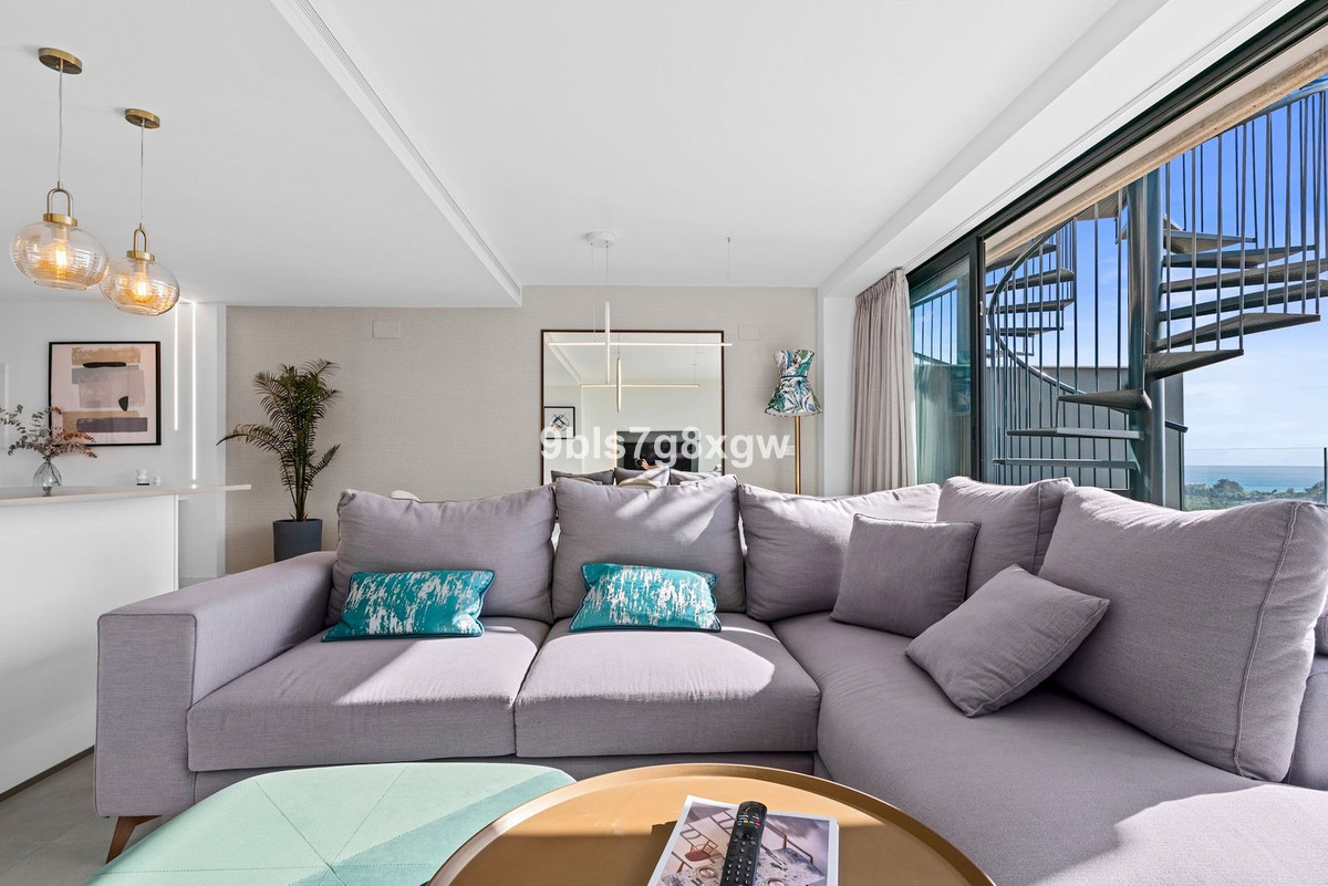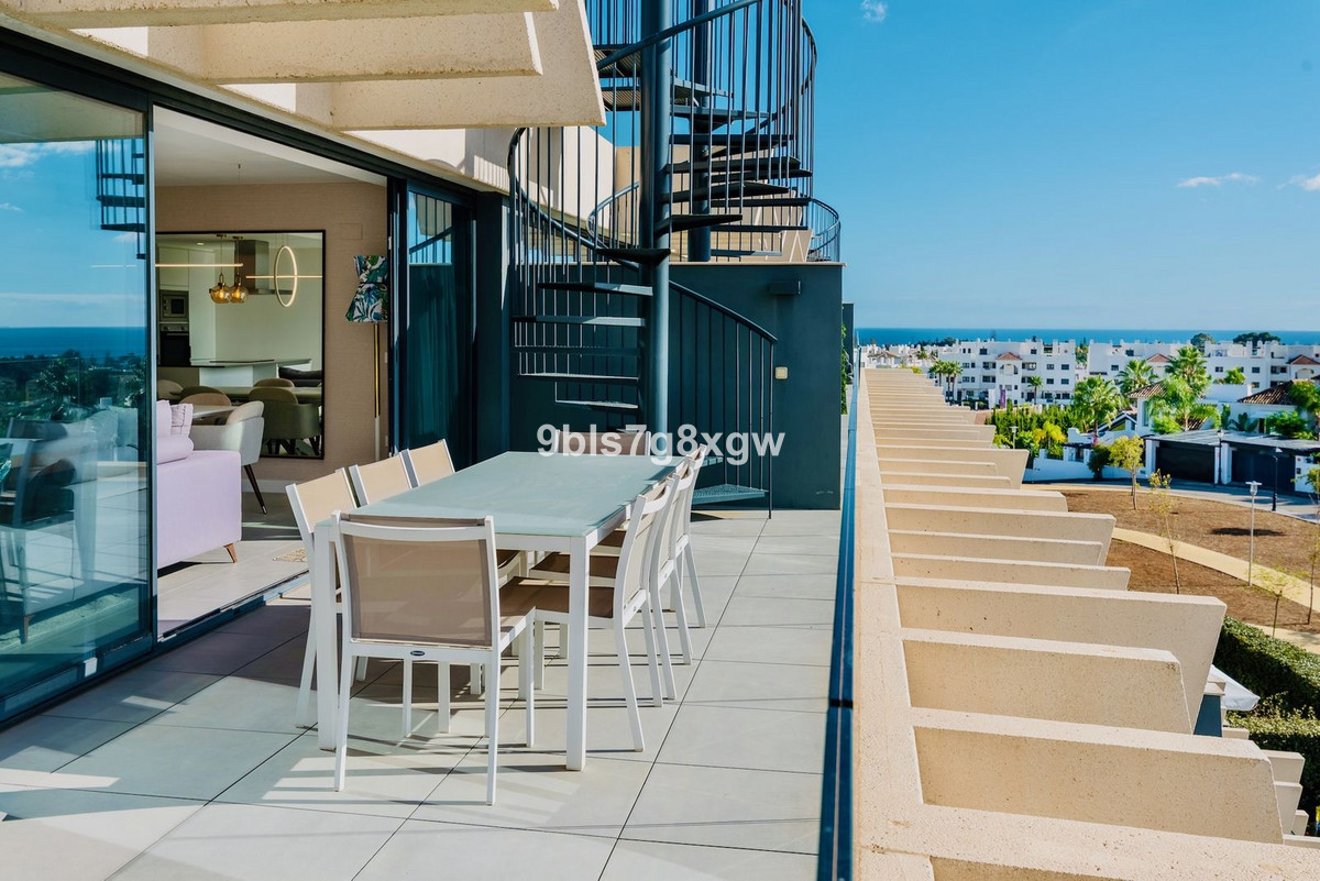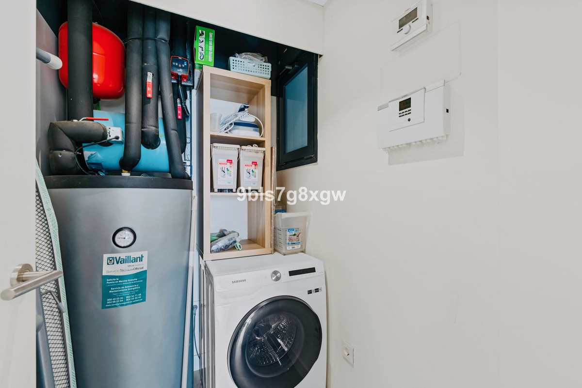 The apartment stands out for its brightness and fluid layout. Large floor-to-ceiling windows create a seamless connection between indoor and outdoor spaces. The fully equipped kitchen (with separate laundry room) opens onto a spacious living-dining area, leading to a large 31m² private South-West facing terrace, partially covered: the ideal spot for al fresco dining, a quiet reading moment, or simply enjoying the panoramic views of the sea, Gibraltar and Selwo Zoo. As night falls, after watching the sunset, the view becomes truly magical.