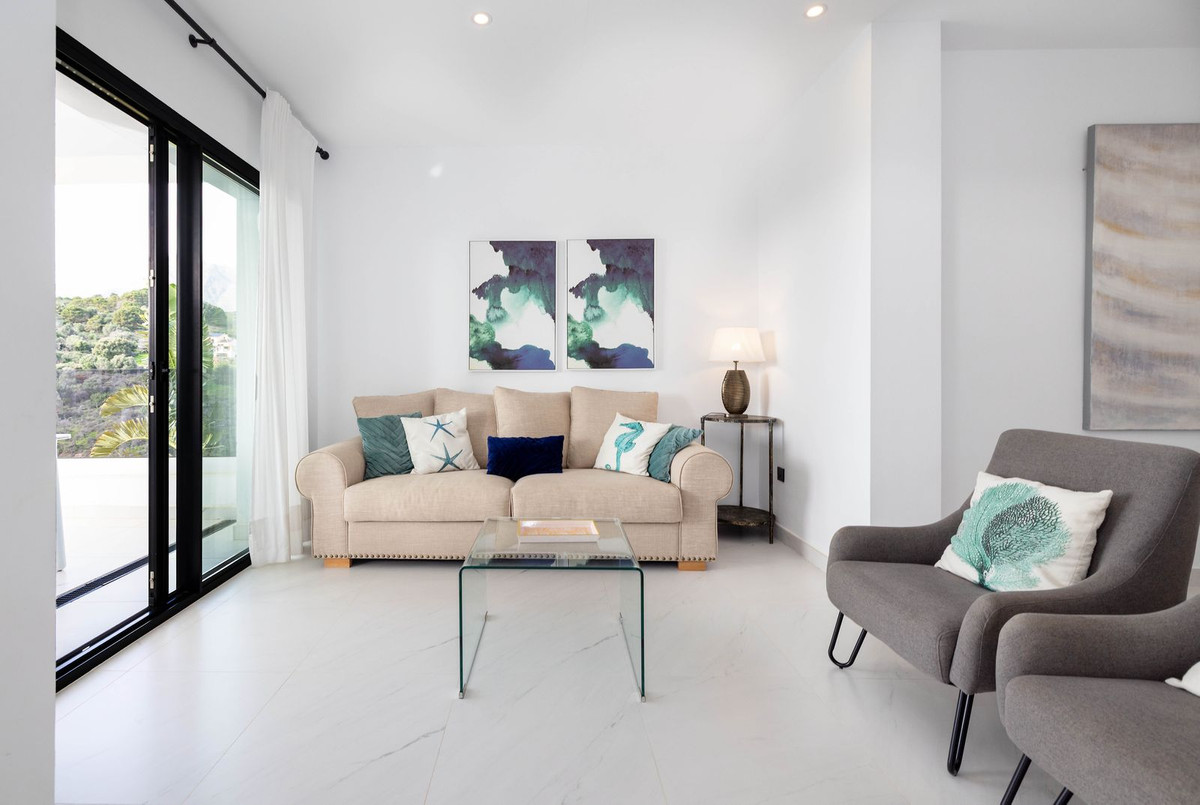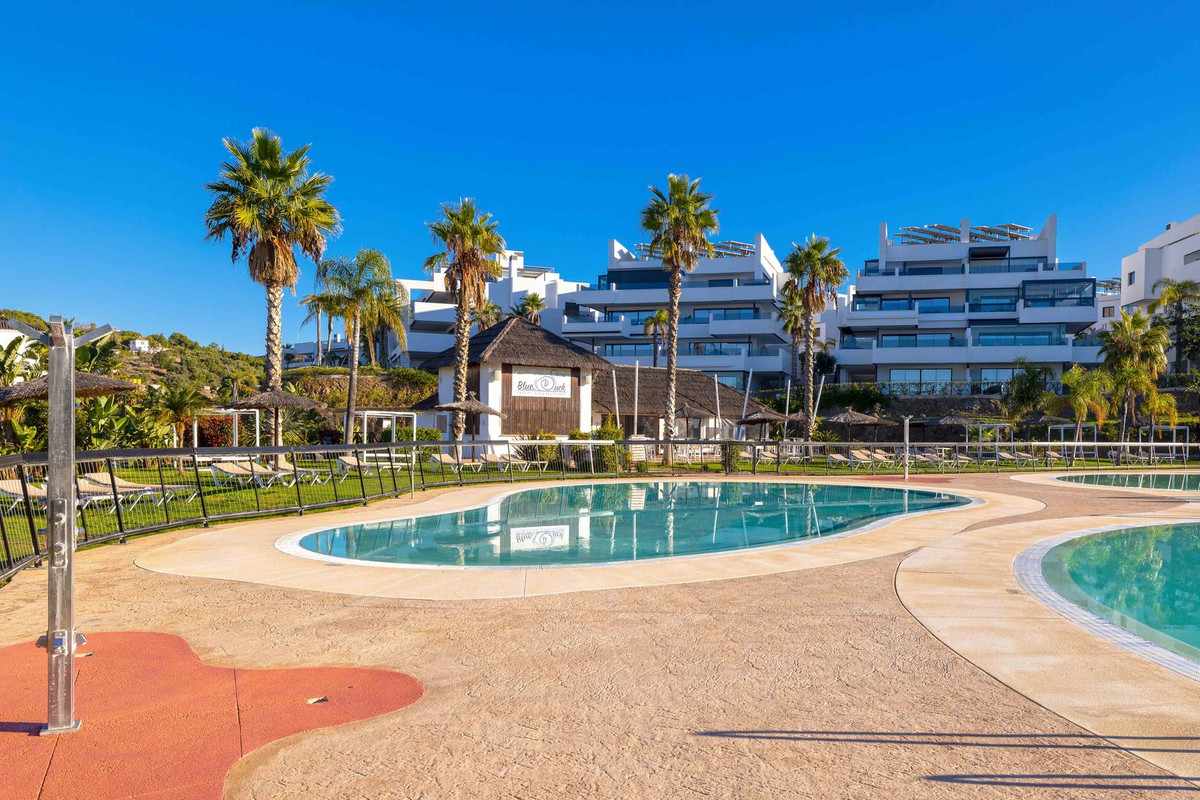 The property features 2 bedrooms and 2 bathrooms, arranged in a bright and spacious layout where every detail has been carefully considered to ensure maximum comfort. The living room, with floor-to-ceiling windows, opens onto a private west-facing terrace that enjoys impressive panoramic views of the Estepona mountain range and stunning sunsets over the Costa del Sol.