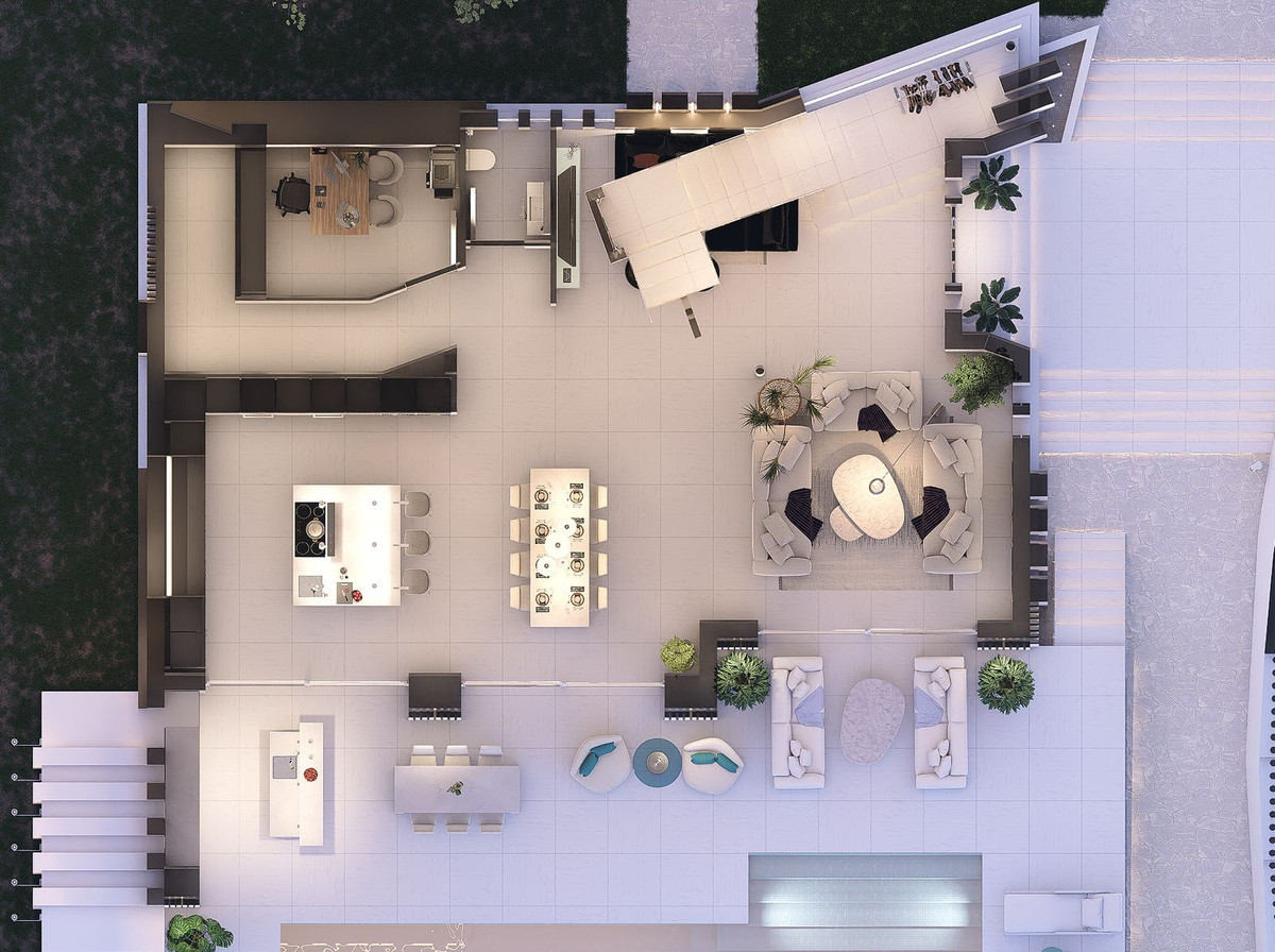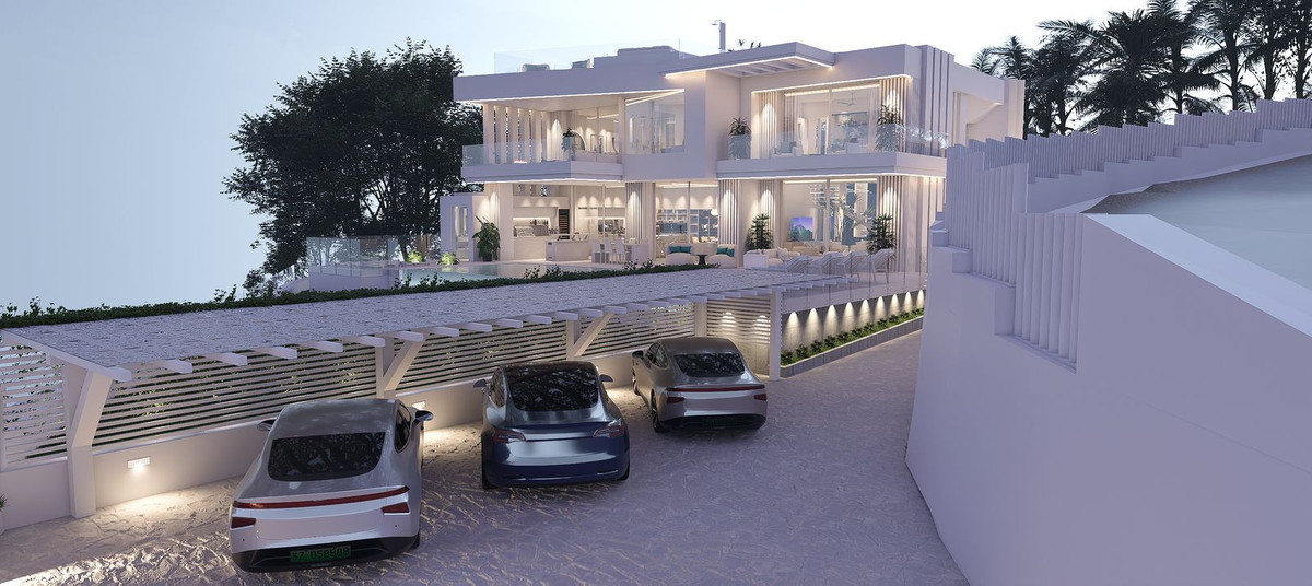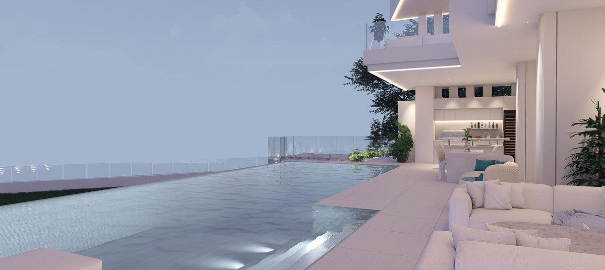 Bostadens design är noggrant planerad för att erbjuda rymliga ytor och hög komfort. Den kommer att innehålla tre sovrum med egna badrum, kök både inomhus och utomhus, arbetsrum, gym, takterrass med avkopplingsytor samt en stor pool anpassad för simning. Källarplanet är förberett för att kunna inrymma ett extra sovrum eller arbetsrum.
