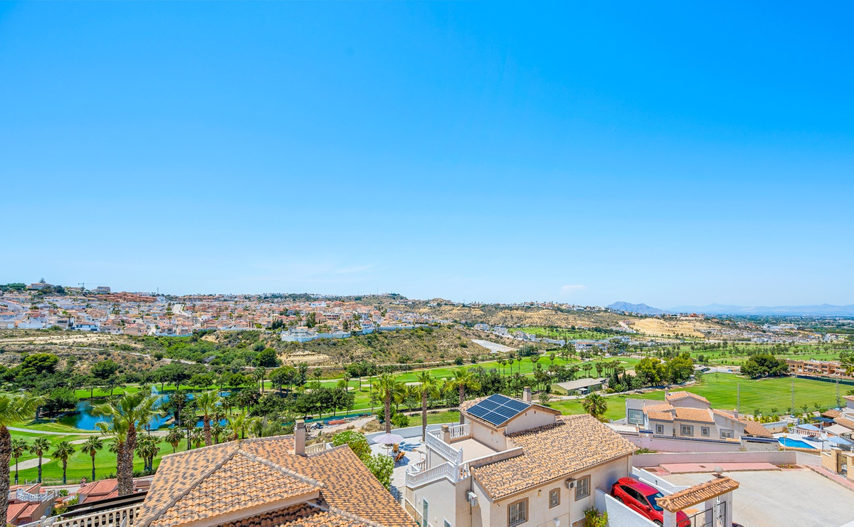 Built in 2006, the property sits on a 137 m² plot and features 105 m² of interior living space thoughtfully distributed across three levels. The main floor welcomes you with a recently renovated, fully equipped kitchen that opens to the dining and living areas in a bright, open-plan layout. This level also includes a guest toilet and two distinct outdoor spaces: a southwest-facing balcony with open views toward the La Marquesa golf course and green zones, and a charming front patio facing the quiet street—ideal for seating or casual outdoor dining.In the first floor you will find two additional bedrooms with fitted wardrobes and a bathroom. From the master bedroom you can enjoy the beautiful views of the golf course and the mountains.