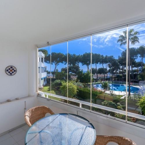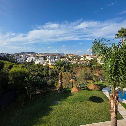 Stunning apartment with sea and mountain views. It has two bedrooms and two bathrooms, and is located in a gated community with a swimming pool.