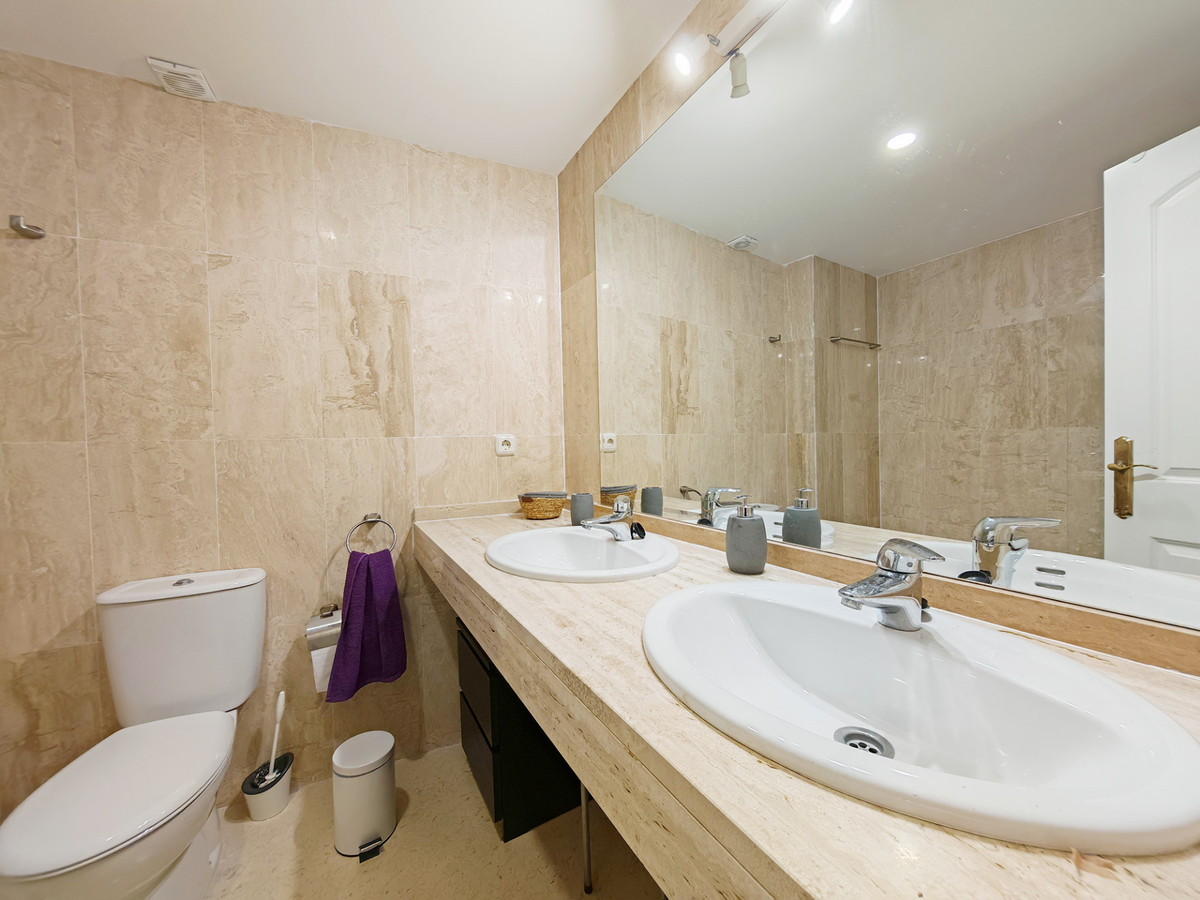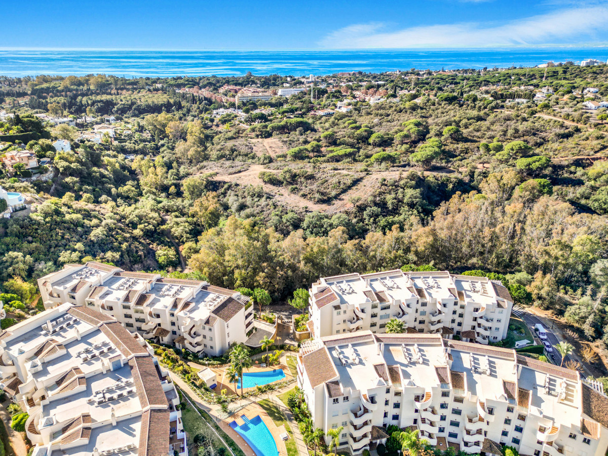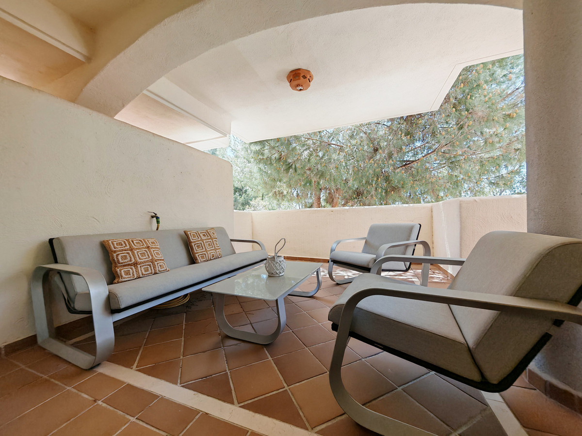 Apartment for sale in Elviria, Marbella with 2 bedrooms, 2 bathrooms, 1 on suite bathroom and with orientation south/west, with communal swimming pool, communal garage (1 parking spaces) and communal garden. Regarding property dimensions, it has 123 m² built and 16.25 m² terrace. Has the following facilities amenities near, air conditioning, fully furnished, fully fitted kitchen, marble floors, private terrace, kitchen equipped, water tank, country view, indoor pool, laundry room, internet - wi-fi, covered terrace, fitted wardrobes, gated community, lift, close to sea / beach, close to golf, balcony, excellent condition, ceiling cooling system, close to town, close to schools, surveillance cameras, inside golf resort and close to restaurants.