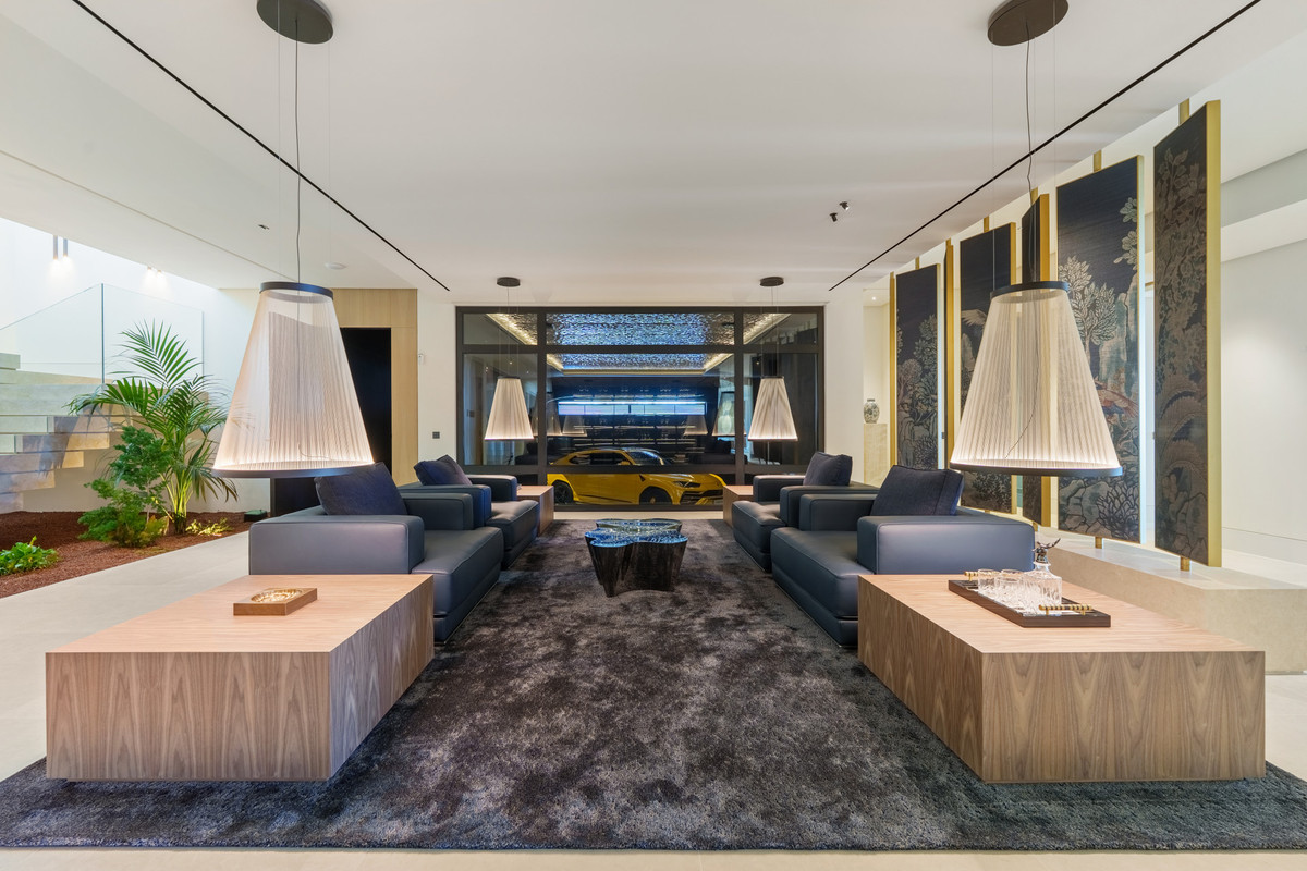 The lower level, encompassing nearly 800 m², is dedicated to wellness and leisure. Naturally lit through floor-to-ceiling windows, it includes a cinema room, professional gym, playroom, spa with indoor pool and jacuzzi, and a private office. Three additional en-suite bedrooms — one with independent access and kitchenette — offer flexibility for guests or staff. A secure garage for eight cars with double EV charging completes the space.
