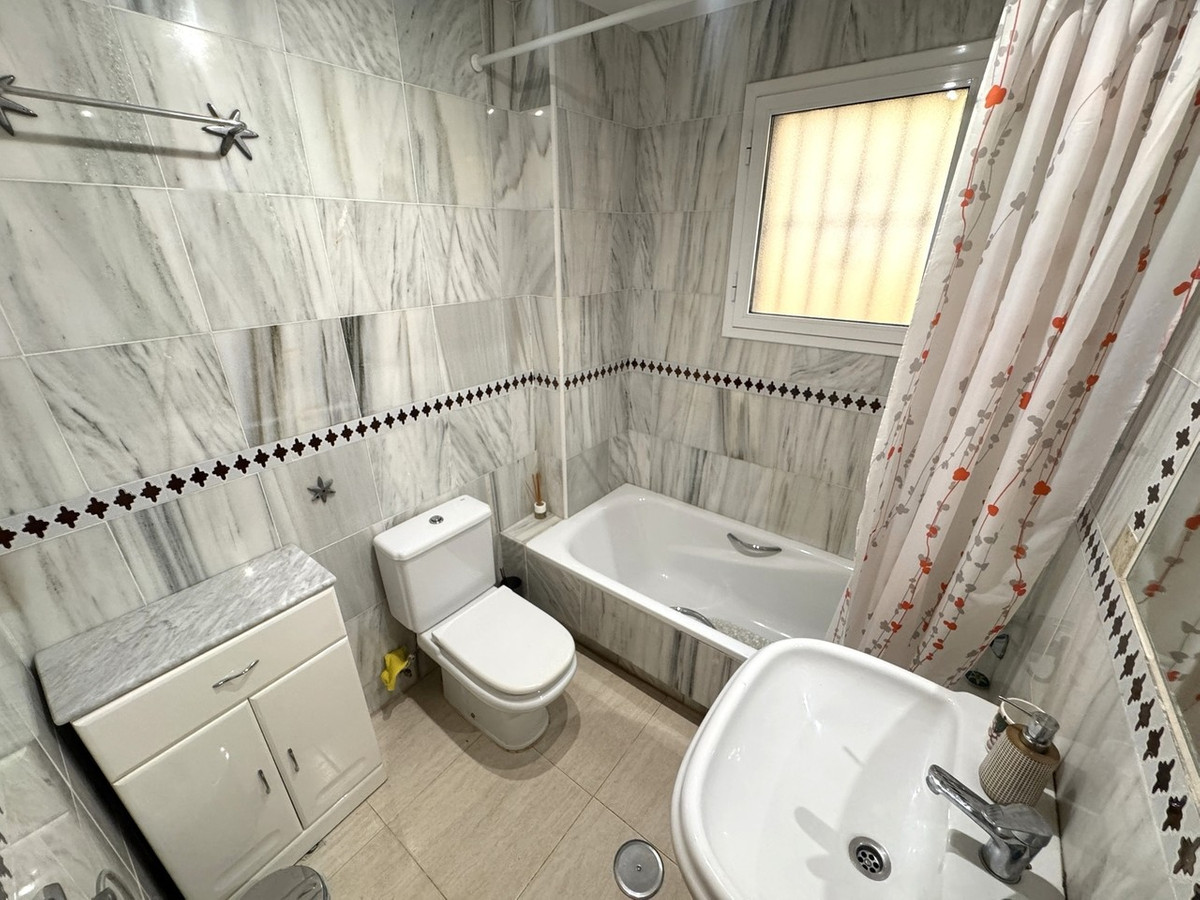 The family bathroom is tastefully tiled and offers a bath tub with overhead shower and curtain.