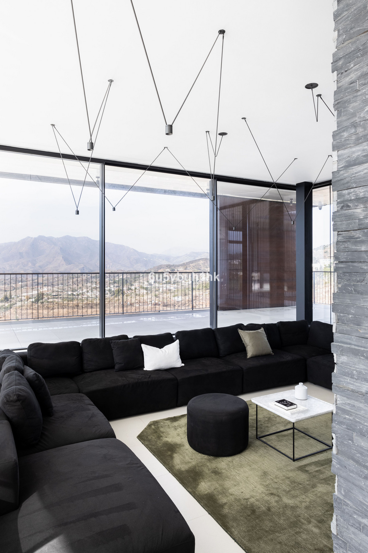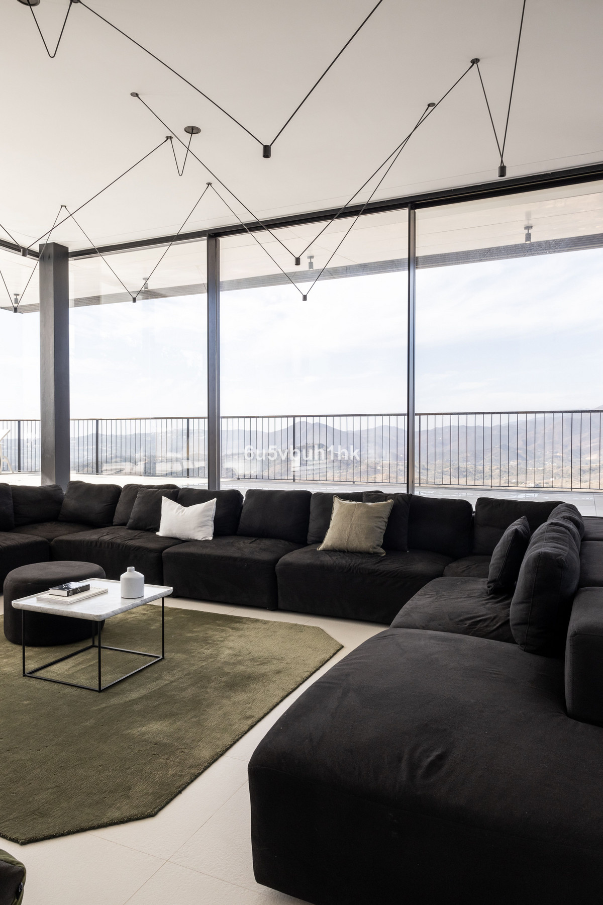 Designen har varit ett samarbete mellan Marion Regitko Architects och brittiska designers Soo Wilkinson & John Grant från Igloo Design. Deras holistiska inställning till villans interiöra och exteriöra utrymmen, tillsammans med kontinuiteten i material och finish har resulterat i ett sömlöst flöde genom hela denna exklusiva villa. Var du än befinner dig i huset kan du gå in på däcket som omger villan på övervåningen. Den lägre nivån är inskuren i kullen och får hela villan att verka som om den har rest sig från klipporna.