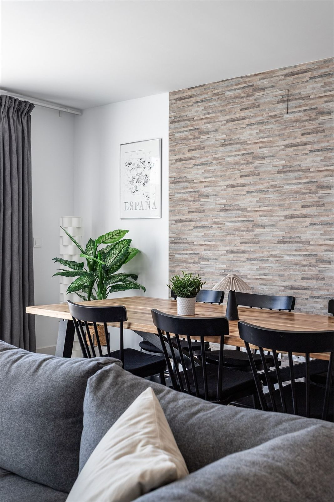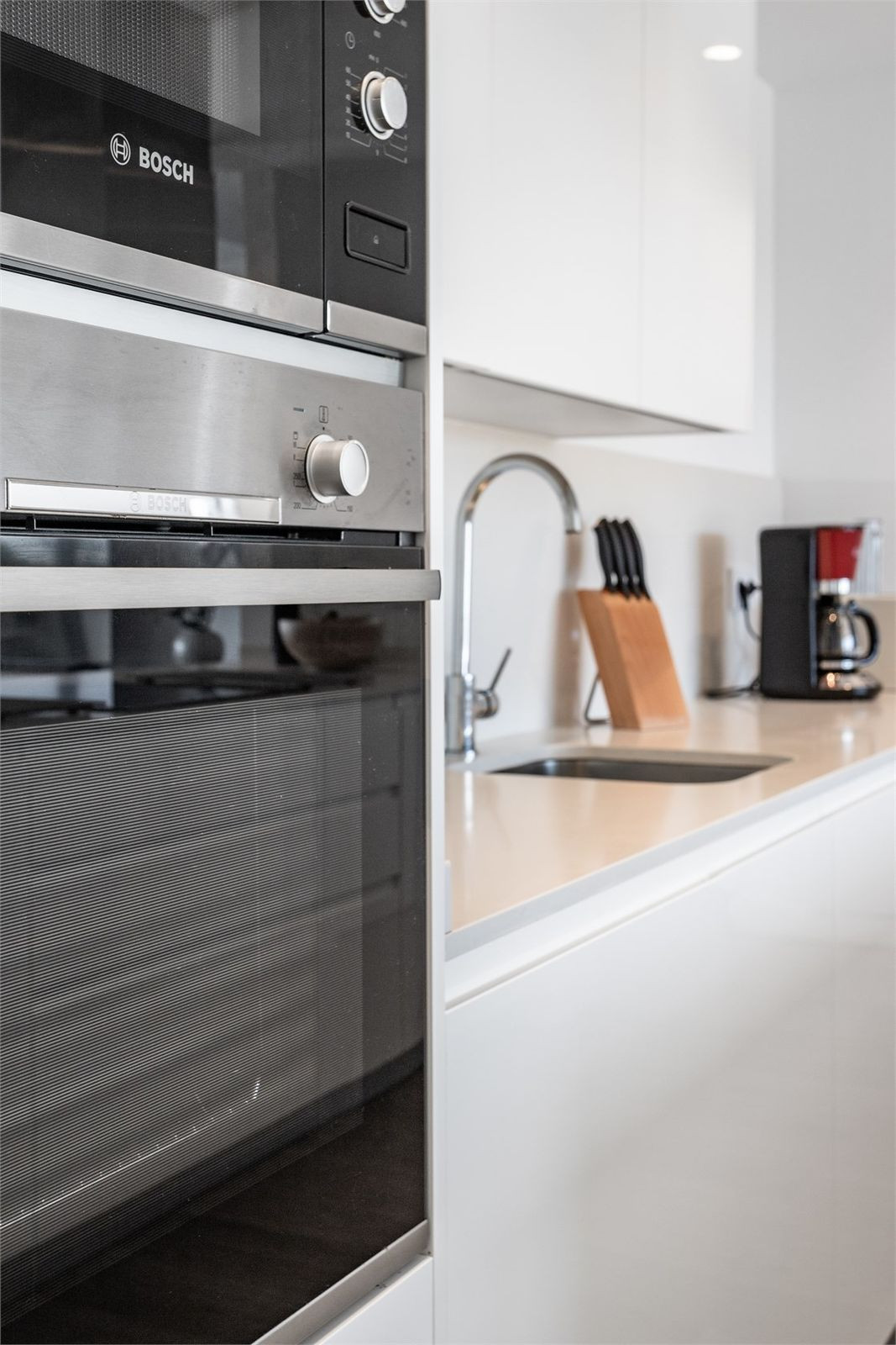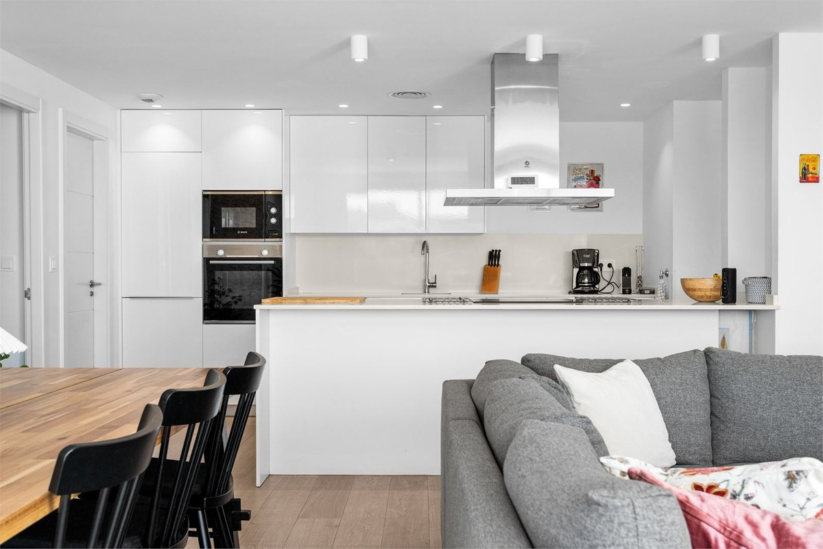 Vardagsrummet är öppet och inbjudande, i direkt anslutning till det stora köket utrustat med vitvaror av hög kvalitet från BOSCH. I anslutning till köket finns ett praktiskt förvaringsutrymme med tvättmaskin samt maskin för uppvärmning av bostaden. Den totala byggytan är 138 kvm, varav boytan utgör 103 kvm.