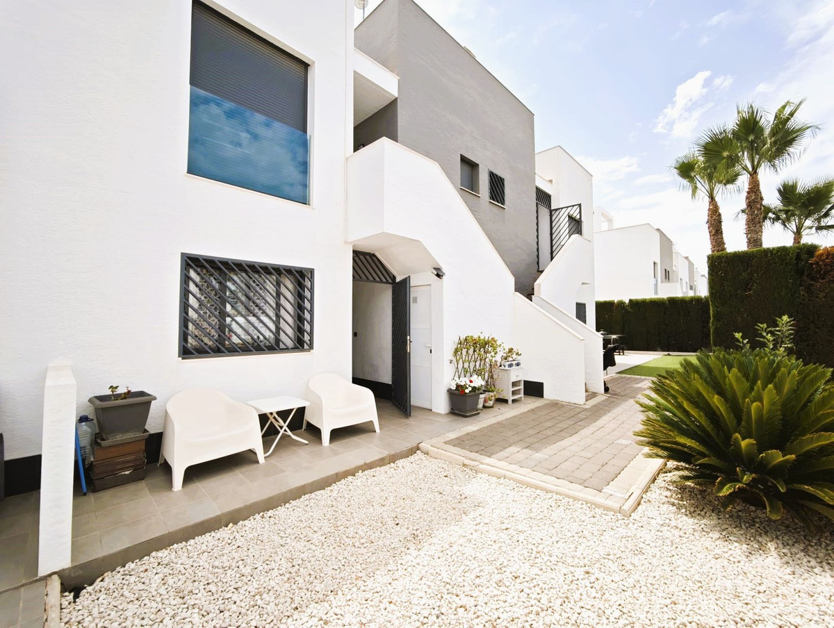 Just 80 mt from the emblematic Zenia Boulevard Shopping Centre, we find this spectacular ground floor Bungalow, modern style construction, semi-new with 2 bedrooms, 2 bathrooms (1 of them en suite), large kitchen specially designed American style fully equipped with high end appliances, spacious living room with access to its large terrace. It is a very bright and warm property special for all year round living or holiday home. Furnished in a modern style, as well as being equipped with many extras such as: Air conditioning, security doors, fibre optics ect.