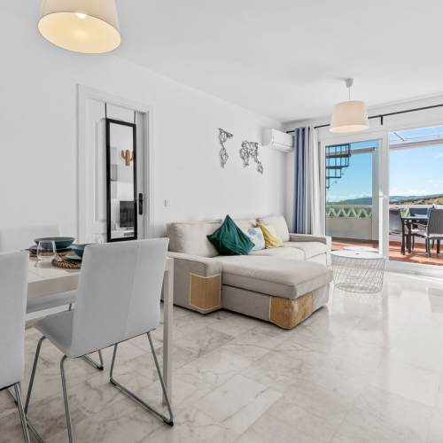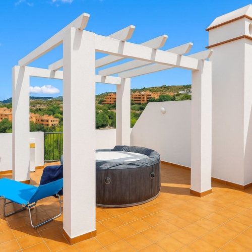 Discover this stunning 3-bedroom penthouse in the sought-after Casares del Sol development, perfectly positioned on the Casares Costa. Offering an exceptional 100m² private solarium and breathtaking views of the sea, pool, and lush gardens, this property captures the essence of Mediterranean living.