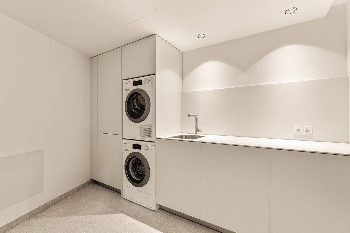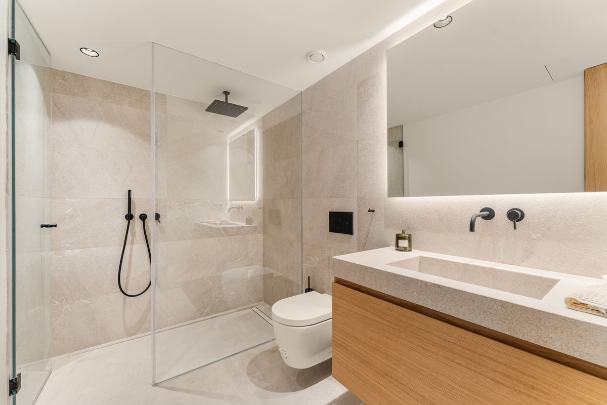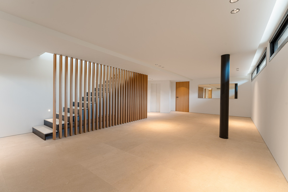 På första våningen har master-sviten en egen terrass, lyxigt badrum och gott om förvaring. Två ytterligare gästsviter delar våningsplanet, båda utformade med fokus på integritet och komfort. Den nedre våningen rymmer ytterligare en gästsvit och ett flexibelt utrymme som kan användas som gym, bio eller spelrum. En hiss förbinder alla våningar och gör det enkelt att röra sig i huset.