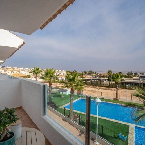 This South West Facing, Two Bedroom, First Floor Apartment in San Luis, is located within a short 10 minute walk to a selection of eating places and café bars, with a main chain supermarket reachable in just a 5 minute drive or approximately a 15 minute walk. The popular towns of Benijofar, Quesada and Torrevieja are all around a 10 minute drive away, and the beautiful sandy beaches can be reached in just 10 minutes, making this an ideal holiday base on the Costa Blanca South. Situated within a friendly complex offering a communal pool and parking, this apartment is accessed easily on the first floor despite the block not having a lift. Inside, you will find a bright living area with air conditioning and double sliding glazed doors that open onto a spacious glazed-in terrace — a perfect dining, relaxing or entertaining space all year round. The open plan fitted kitchen features a breakfast bar, and there are two double bedrooms, the master with built-in wardrobes, plus ceiling fans in both. A modern family shower room completes the interior layout. Residents also benefit from a communal solarium, ideal for enjoying the sunshine.\n