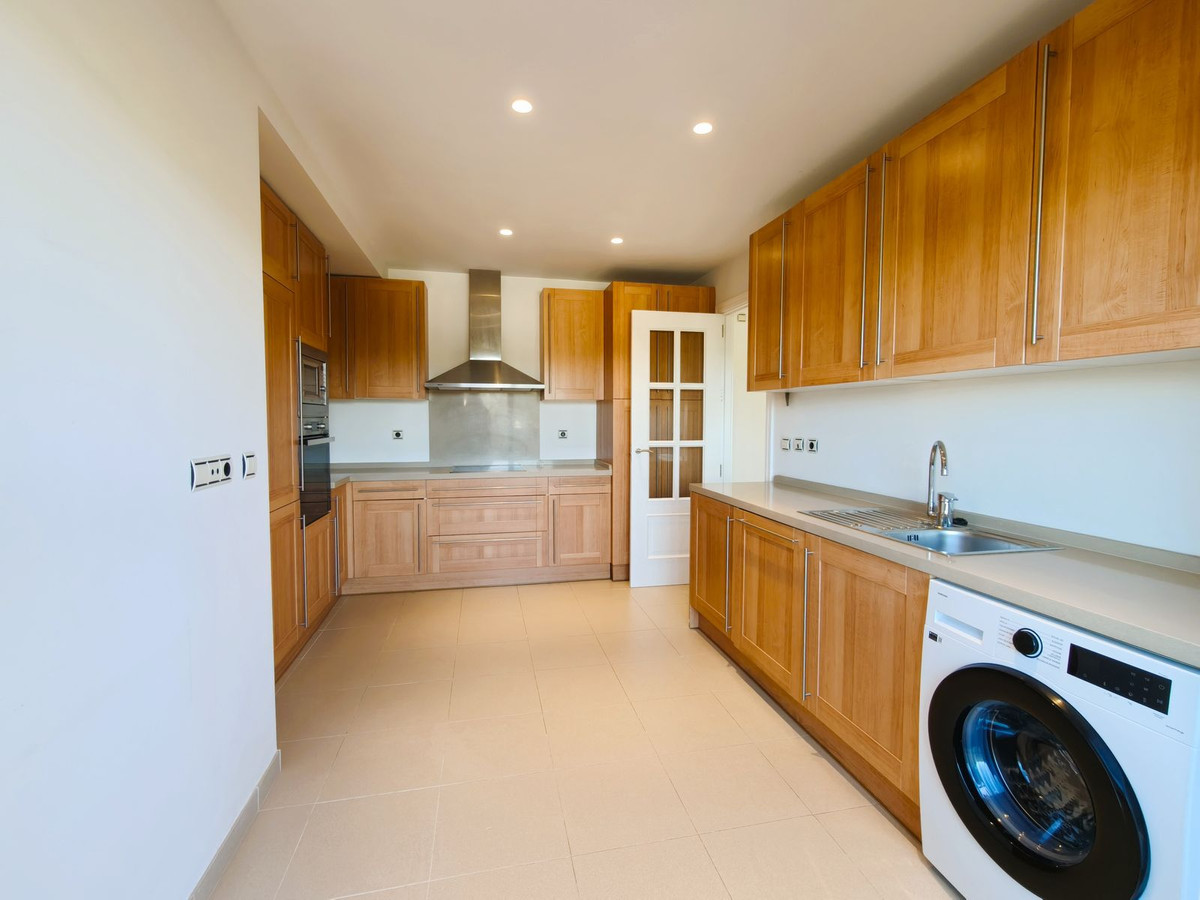 The fully equipped kitchen includes a private breakfast terrace, while modern comforts such as air conditioning (hot/cold), underfloor heating in the bathrooms, and a guest toilet ensure year-round luxury. Direct lift access leads to the garage and storeroom, with three private parking spaces for ultimate convenience.