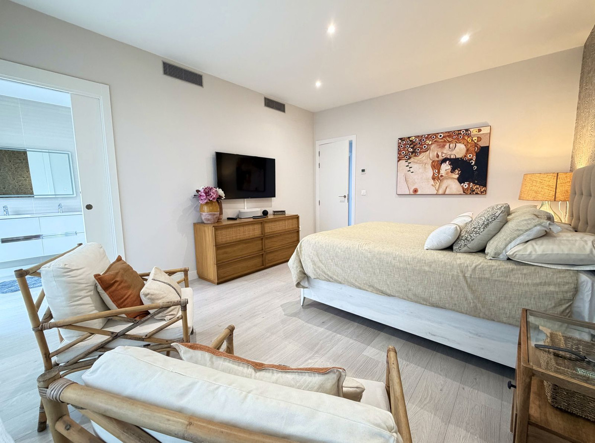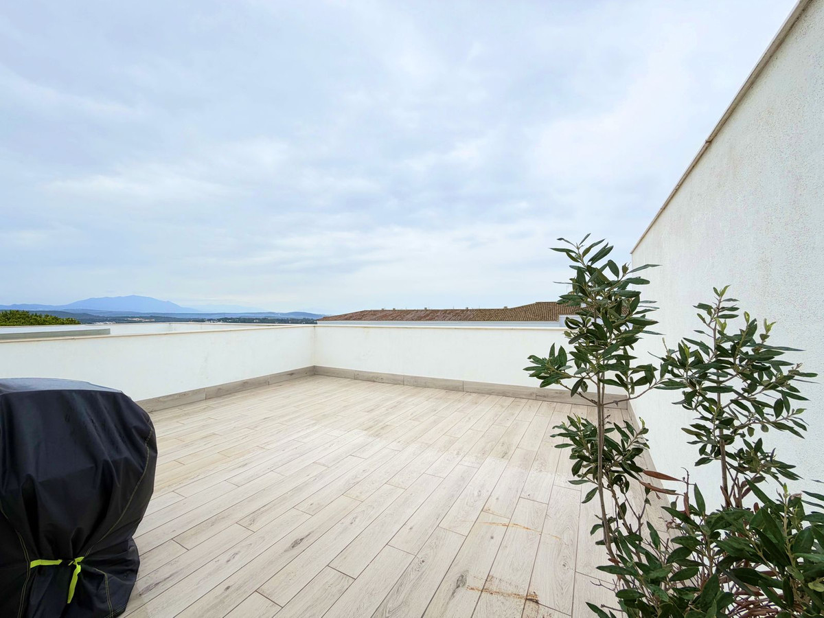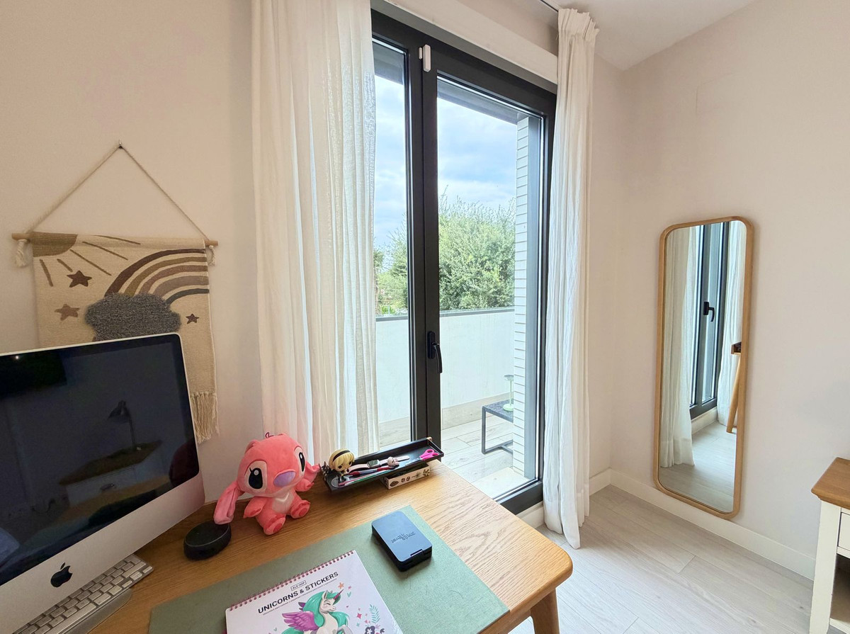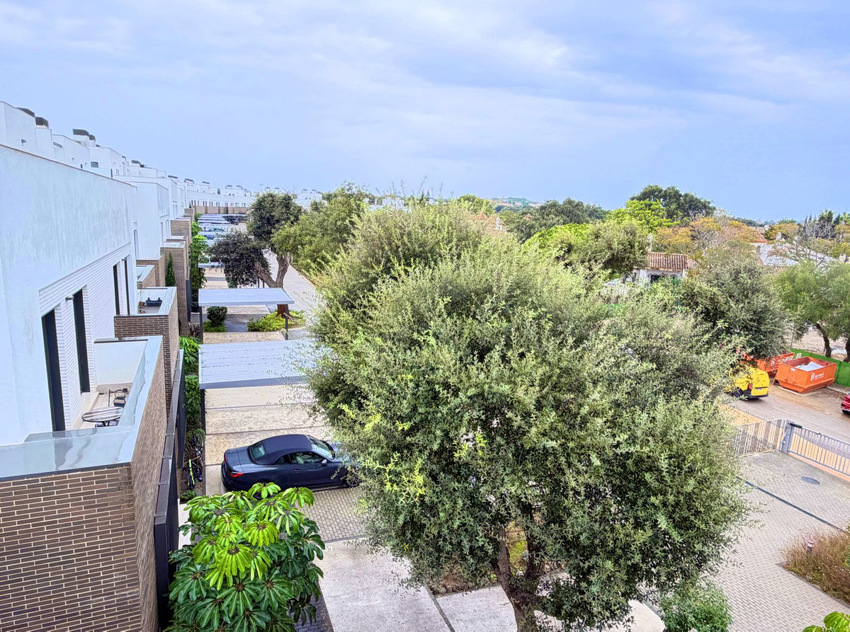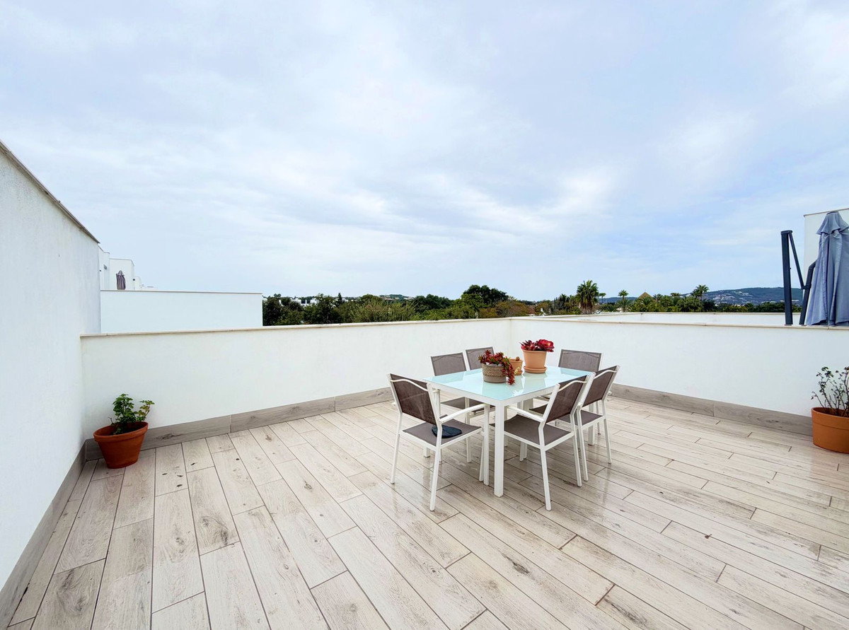 On the upper floor, the master bedroom stands out with its en-suite bathroom and a glass-enclosed balcony. Two additional bright bedrooms, both with fitted wardrobes, share a full bathroom and have access to a second balcony overlooking the community entrance. One level above, the rooftop solarium offers a spectacular setting: a large open space with panoramic views of the sea, golf course, and natural surroundings—ideal for creating a chill-out area, adding a barbecue, or simply enjoying sunlight and privacy. Two private parking spaces, electric blinds, high-quality finishes, and the option to convert the current study into a fourth bedroom complete a home designed for enjoyment without compromise.