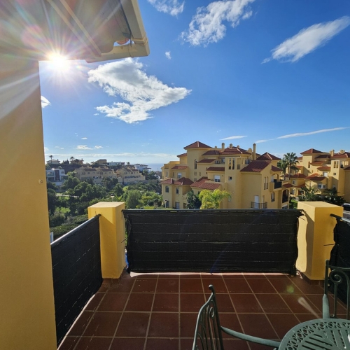 The property consists of 2 bedrooms and 2 bathrooms, one of which has been completely renovated. The modern, fully equipped kitchen has also been entirely refurbished. The bright living room has direct access to a large south-facing terrace, ideal for enjoying the sun all day long and the unobstructed views. Upstairs, the second bedroom also has direct access to a spacious second terrace, offering even more panoramic views of the golf course and the sea. The residence offers private parking spaces within the urbanization. Set in a peaceful and green environment, the complex features two communal swimming pools and well-maintained gardens. The apartment is surrounded by prestigious golf courses such as El Chaparral and Miraflores Golf. The beaches of Mijas Costa are just 2 km away. Nearby, you will find numerous restaurants, cafés, supermarkets, pharmacies, as well as the El Zoco shopping center and La Cala de Mijas, both only a few minutes away. A bright, well-maintained, and ideally located penthouse — perfect as a primary residence, a holiday home, or a rental investment.