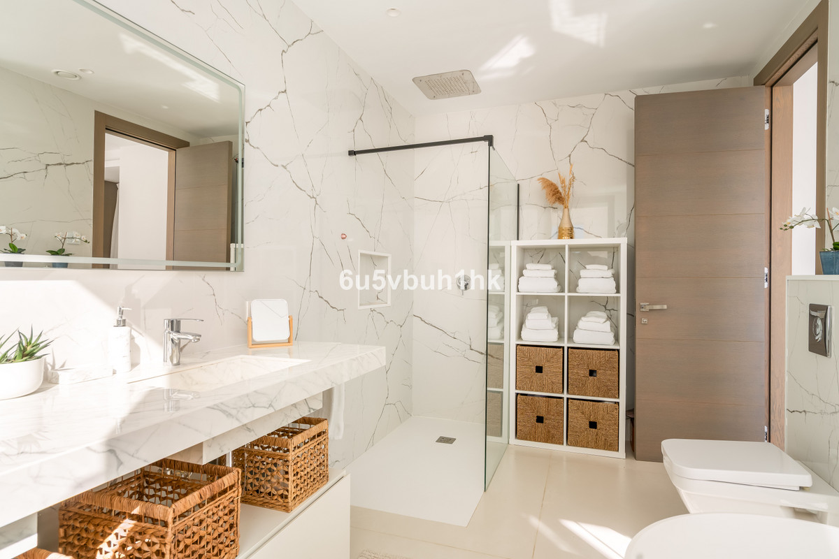 Ovanpå hittar du två eleganta sovrumssuiten, inklusive en spektakulär mastersvit med lyxigt badrum en suite, generösa ytor och egen privat terrass. Våningen erbjuder också en wrap-around-terrass med panoramavy över havet – det perfekta stället att njuta av Marbellas gyllene soluppgångar.