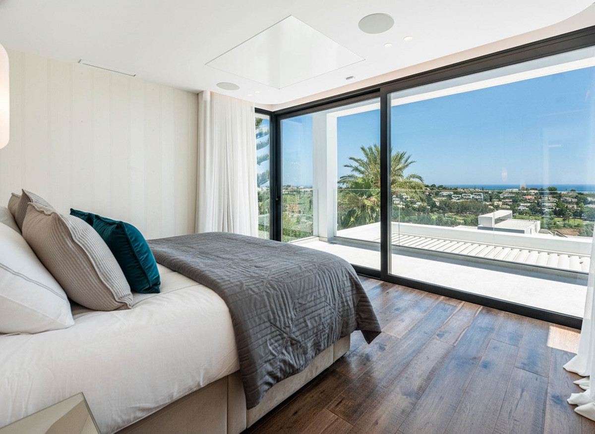 The villa offers six bedrooms, all with en-suite bathrooms designed for comfort and privacy. The primary suite enjoys sea views and access to a private terrace. The upper level includes a solarium with a jacuzzi and panoramic views stretching from the golf course to Africa, providing a dedicated space to take in the surroundings from the highest point of the property.