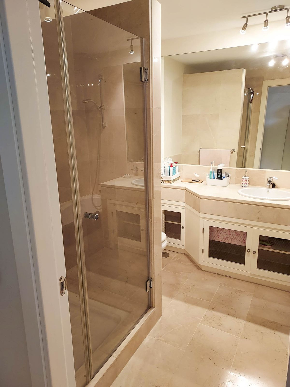 Interiören består av två dubbelrum med inbyggda garderober och två kompletta badrum, varav ett har eget badrum. Lägenheten har ett halvöppet kök som kan omvandlas till ett helt öppet utrymme om så önskas, samt ett ljust vardagsrum/matsal med stora fönster som ger naturligt ljus hela dagen, tack vare dess sydostliga läge.