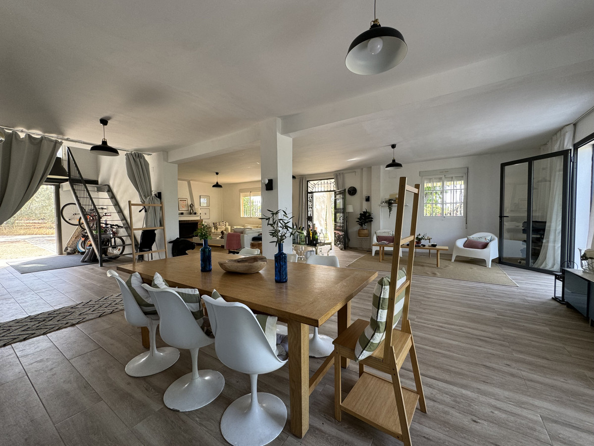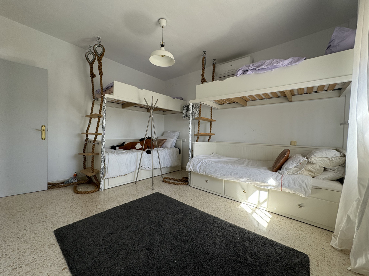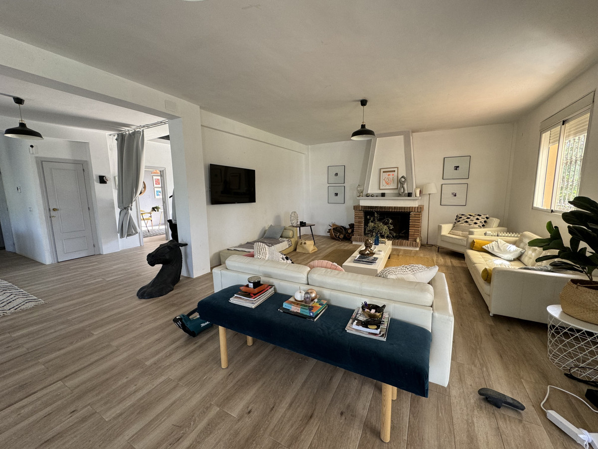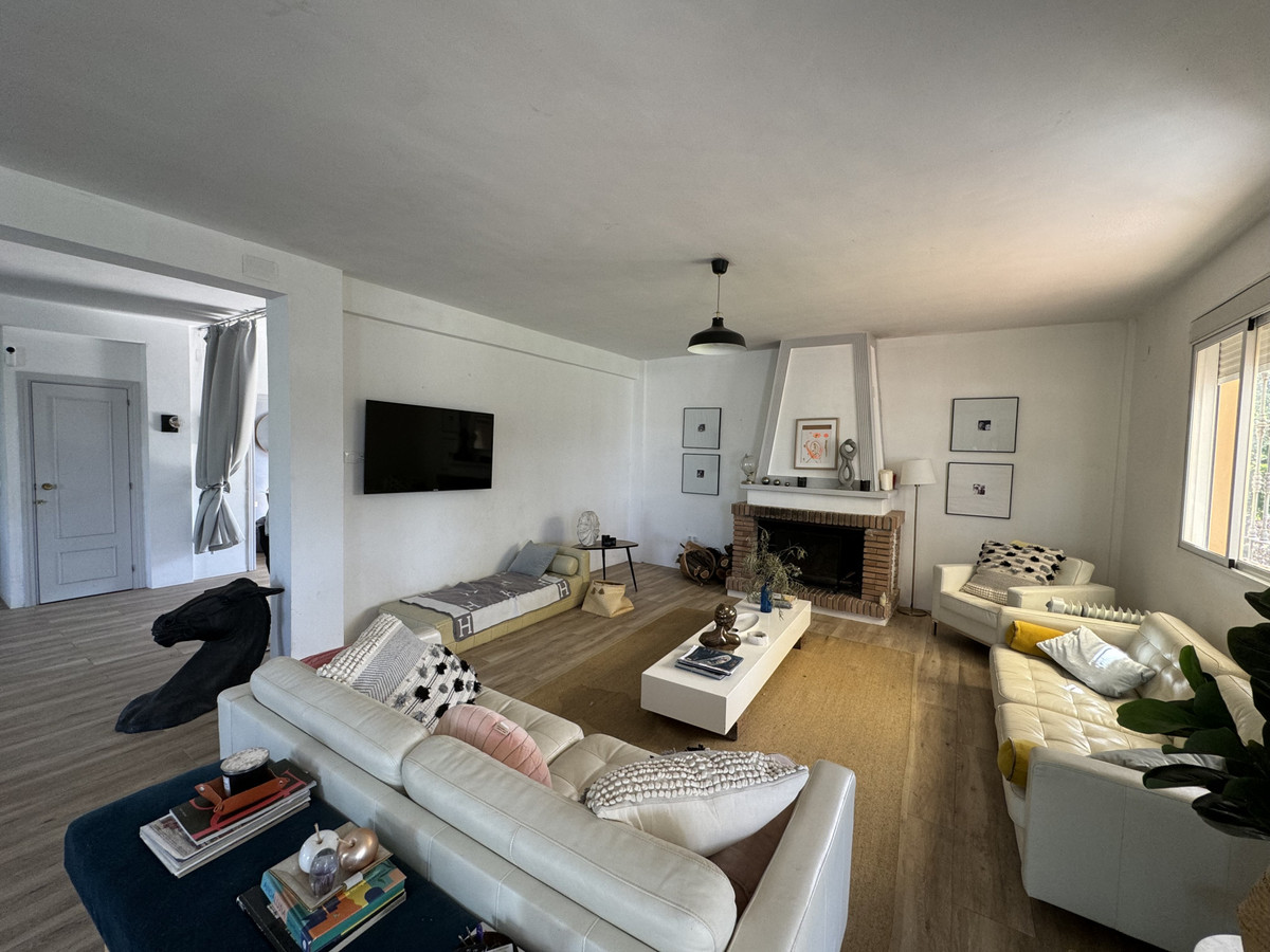 With 310 m² of living space across two floors, the residence features seven bedrooms, five bathrooms (including four en-suite), and two guest toilets, making it ideal for multi-family living or a high-yield rental property. The bright, modern kitchen seamlessly integrates with the open-plan living area, complemented by a cozy fireplace and elegant wood-effect tiled floors.