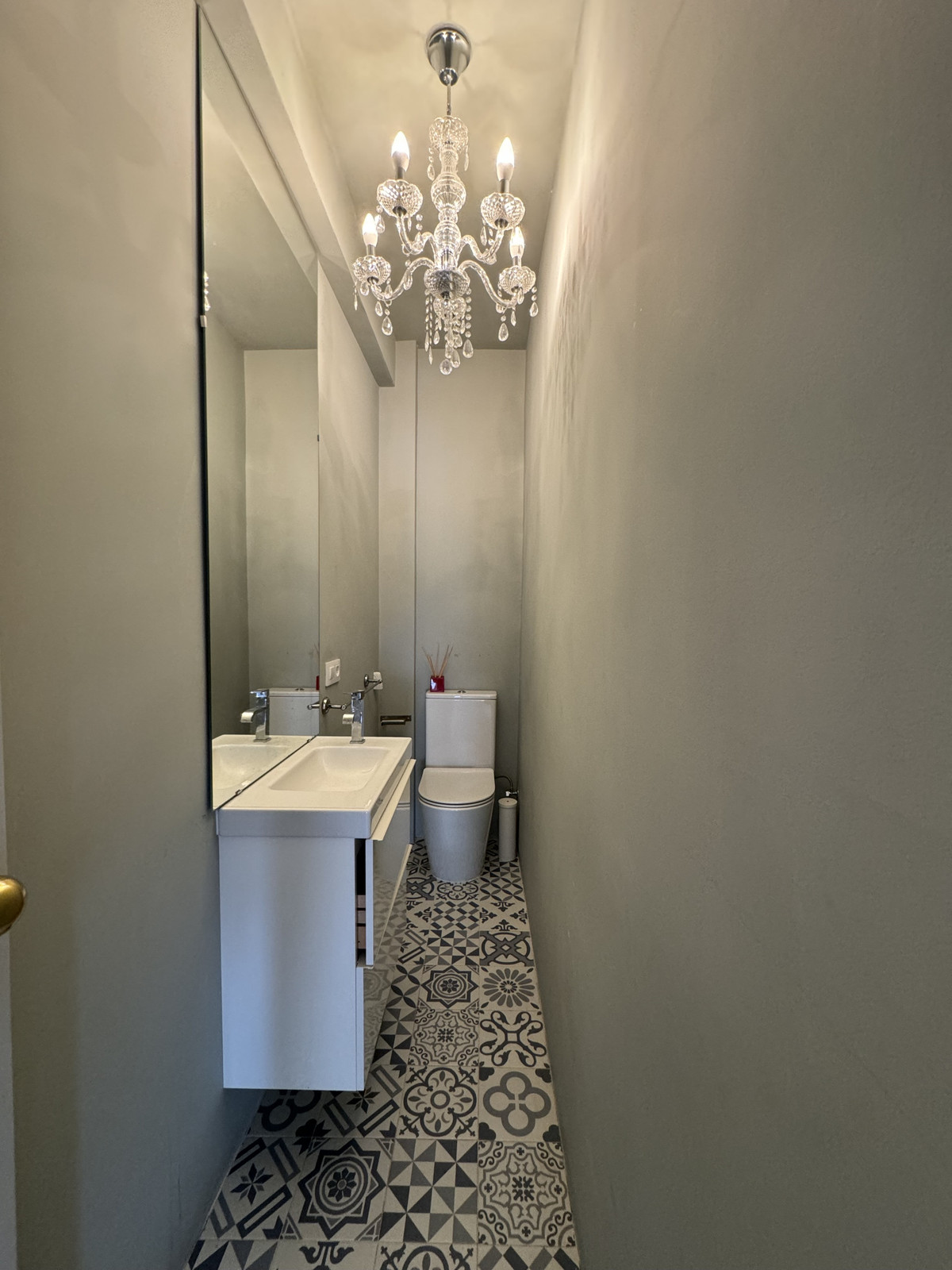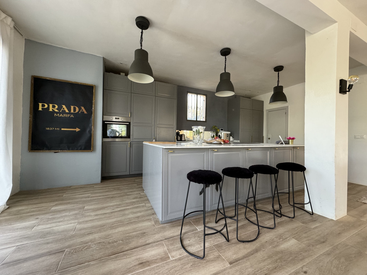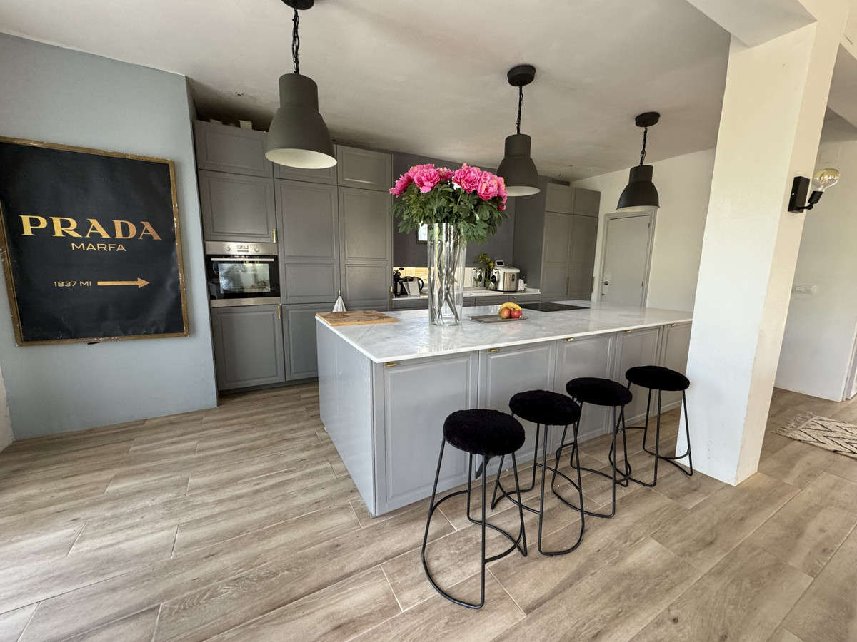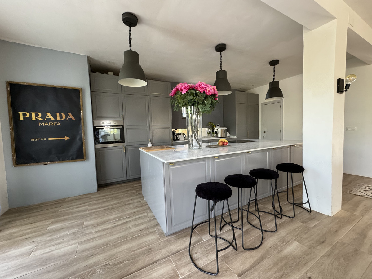 With 310 m² of living space across two floors, the residence features seven bedrooms, five bathrooms (including four en-suite), and two guest toilets, making it ideal for multi-family living or a high-yield rental property. The bright, modern kitchen seamlessly integrates with the open-plan living area, complemented by a cozy fireplace and elegant wood-effect tiled floors.