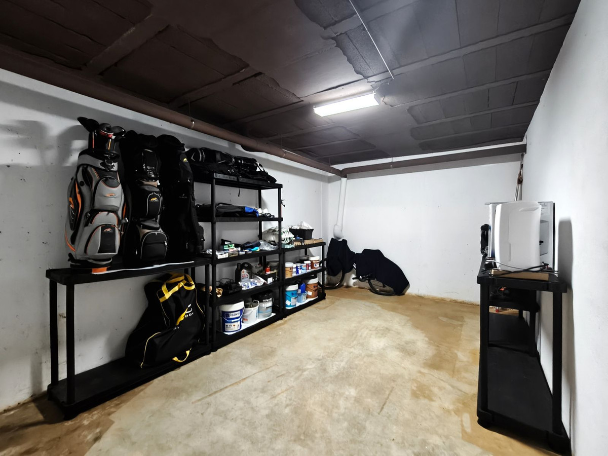 The spacious living and dining area opens through double doors onto a large south-facing covered terrace, perfect for relaxing or entertaining. The property boasts a fully equipped kitchen, a separate laundry room, a guest WC, and a storage room. Additional features include underfloor heating, air conditioning throughout, and a high-quality integrated sound system. It also benefits from a double garage space and an extra storeroom.