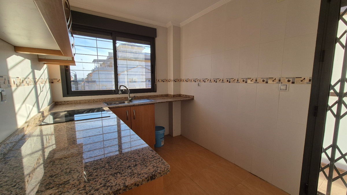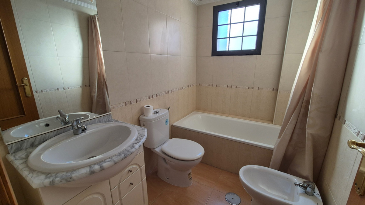 Detta charmiga hus med 3 sovrum och 2 badrum ligger i det eftertraktade området Aguas Nuevas i Torrevieja, vilket erbjuder en lugn och välkomnande miljö. Fastigheten har en sydlig orientering, vilket säkerställer gott om naturligt solljus under dagen. Inuti har hemmet ett rymligt vardagsrum, ett välutrustat kök och bekväma sovrum, perfekt för familjer eller dem som söker extra utrymme. Master-sovrummet har ett eget badrum, medan de andra två sovrummen delar ett familjebadrum.