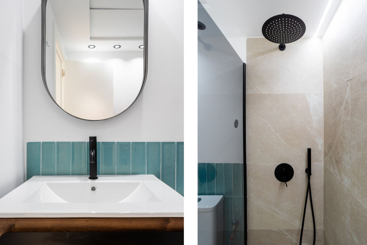 Stilrent badrum utrustat med handfat med kommod, toalett och dusch med glasvägg.