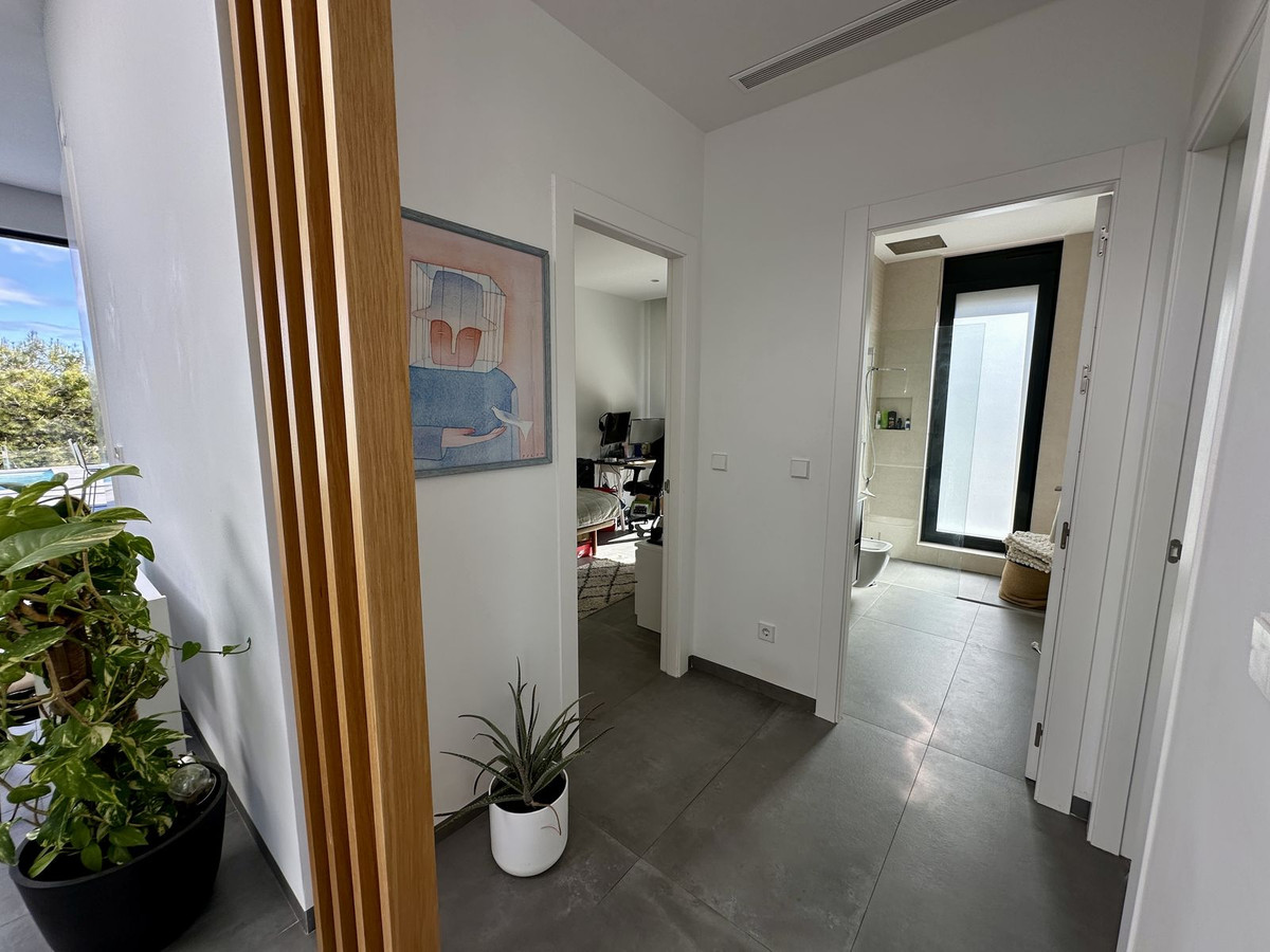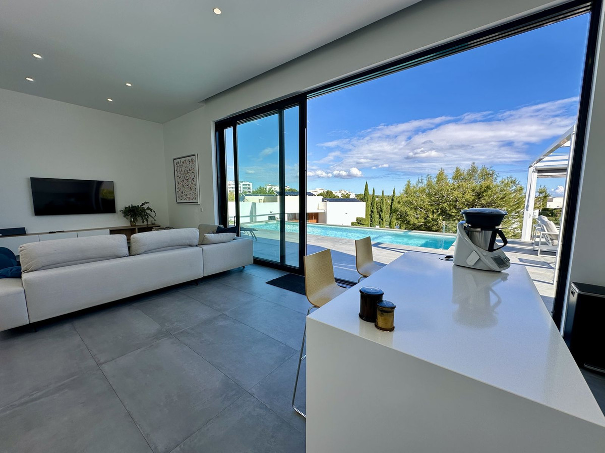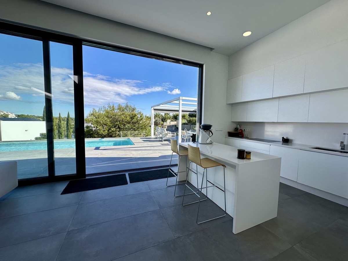 Step inside to be welcomed by soaring ceilings and an abundance of natural light. A striking picture window seamlessly blends the interior living space with an expansive 87 m² south-facing terrace, showcasing a 10-meter heated saltwater pool with tranquil views over the pine trees.
