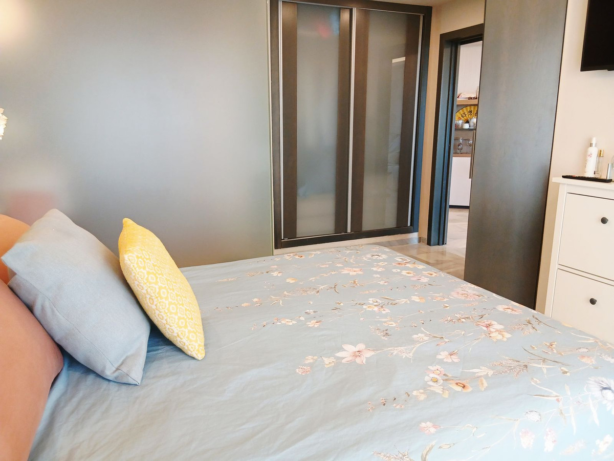 The master suite is a sanctuary of its own, featuring an en-suite bathroom with a contemporary glass partition that enhances natural light and visual openness. Waking up to the Mediterranean horizon becomes part of the daily ritual, with direct access to the terrace and its captivating vistas. The second bedroom, equally generous, contributes to an atmosphere of comfort, privacy and understated luxury. Every detail within the home — from the finishes to the lighting — has been thoughtfully curated to offer a lifestyle of refinement and ease.