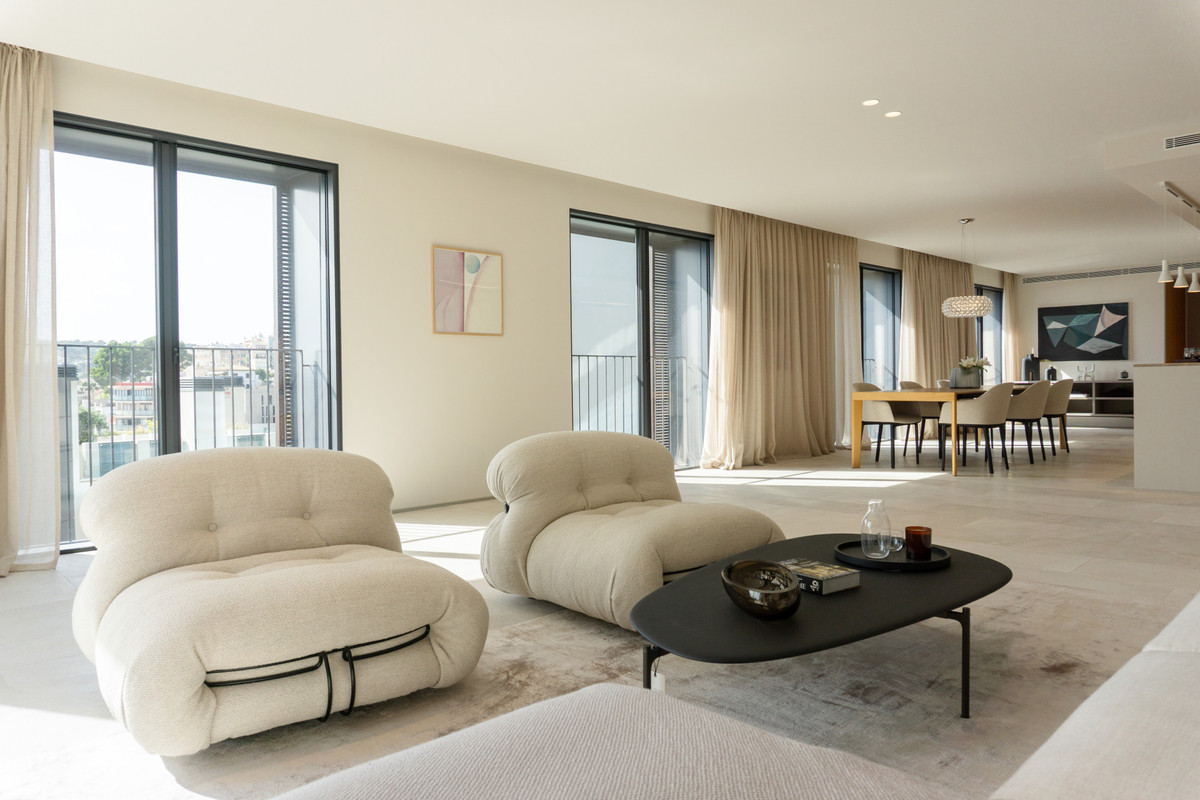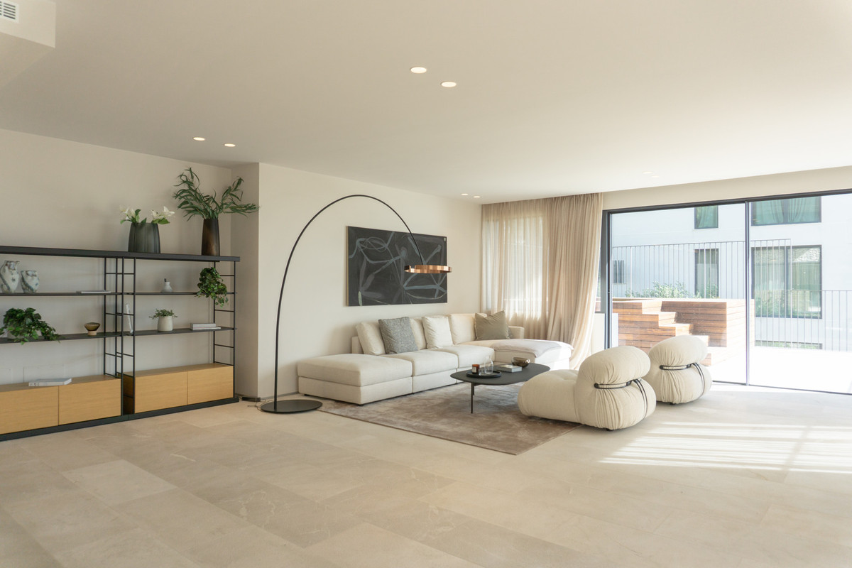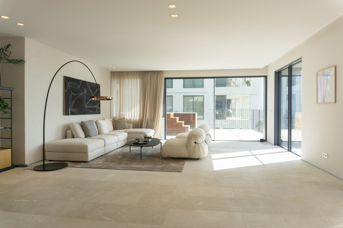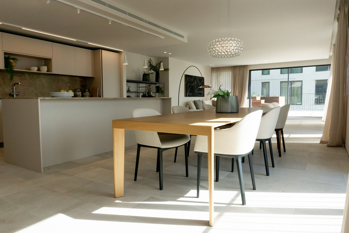 Det huvudsakliga vardagsrummet ansluter till ett skräddarsytt kök utrustat med högpresterande Miele-apparater och anpassade Molteni & Dada-skåp. En granitö fungerar som centrum för både vardag och underhållande. Badrummen fortsätter det moderna designspråket, med mikrocement och marmorfinish som höjer upplevelsen. Integrationen av teknik, inklusive luftvärme, golvvärme och takmonterad luftkonditionering, säkerställer optimal klimatkontroll året runt.