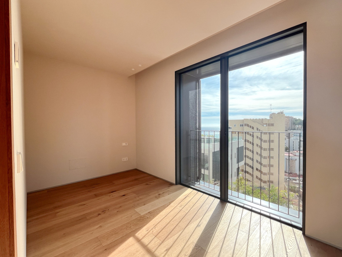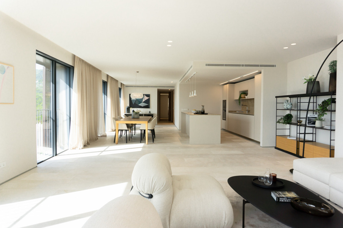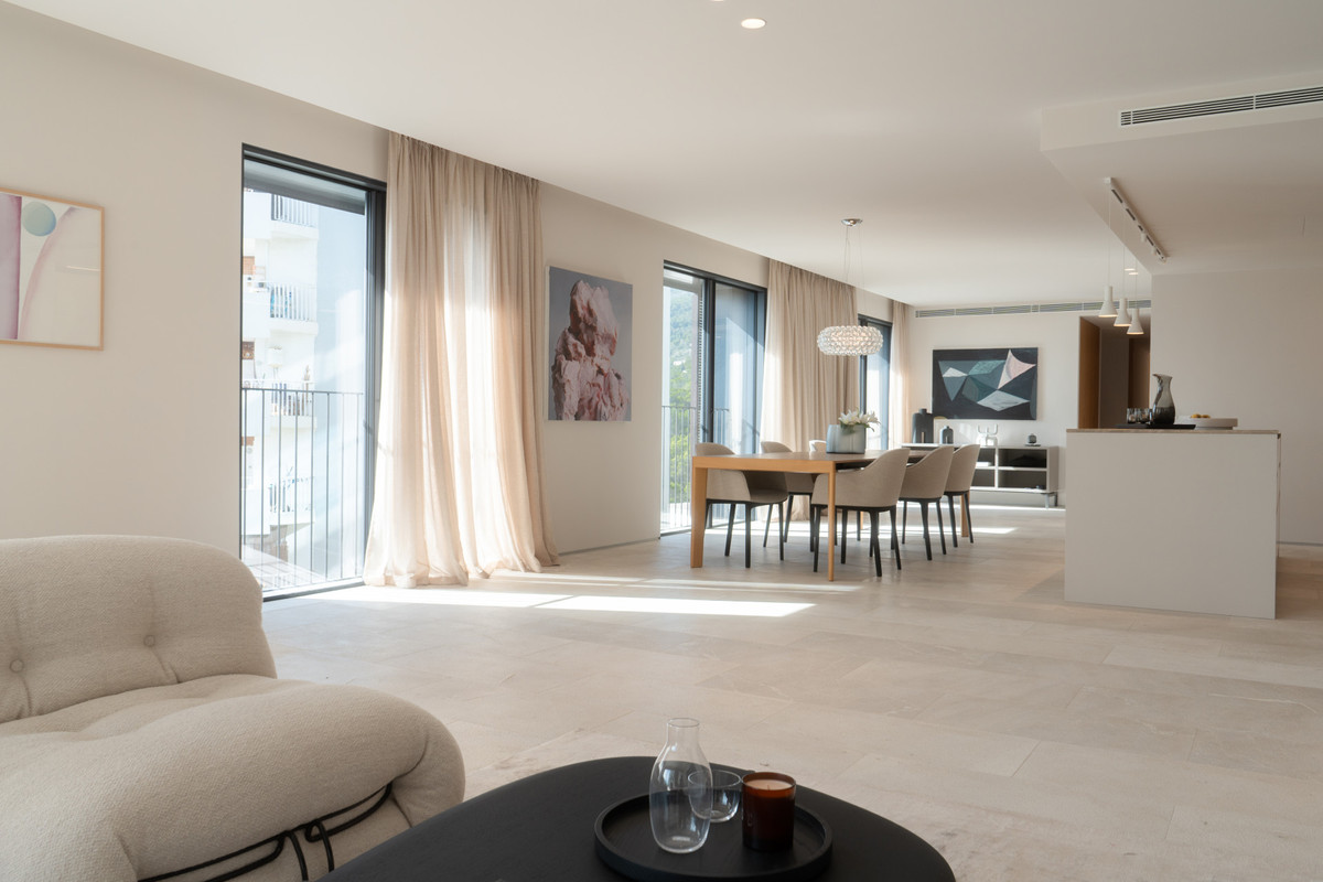 Beläget på Carrer de Miquel Rosselló i Alemany, upptar denna lägenhet en utmärkt position i en av Cala Majors mest dynamiska gator. Den sydvändiga orienteringen maximerar naturligt ljus och fångar oavbruten utsikt över Medelhavet och omgivande sluttning. Den arkitektoniska visionen är modern och minimal, med en antracit aluminiumfasad som antyder de sofistikerade inredningsdetaljer som följer.