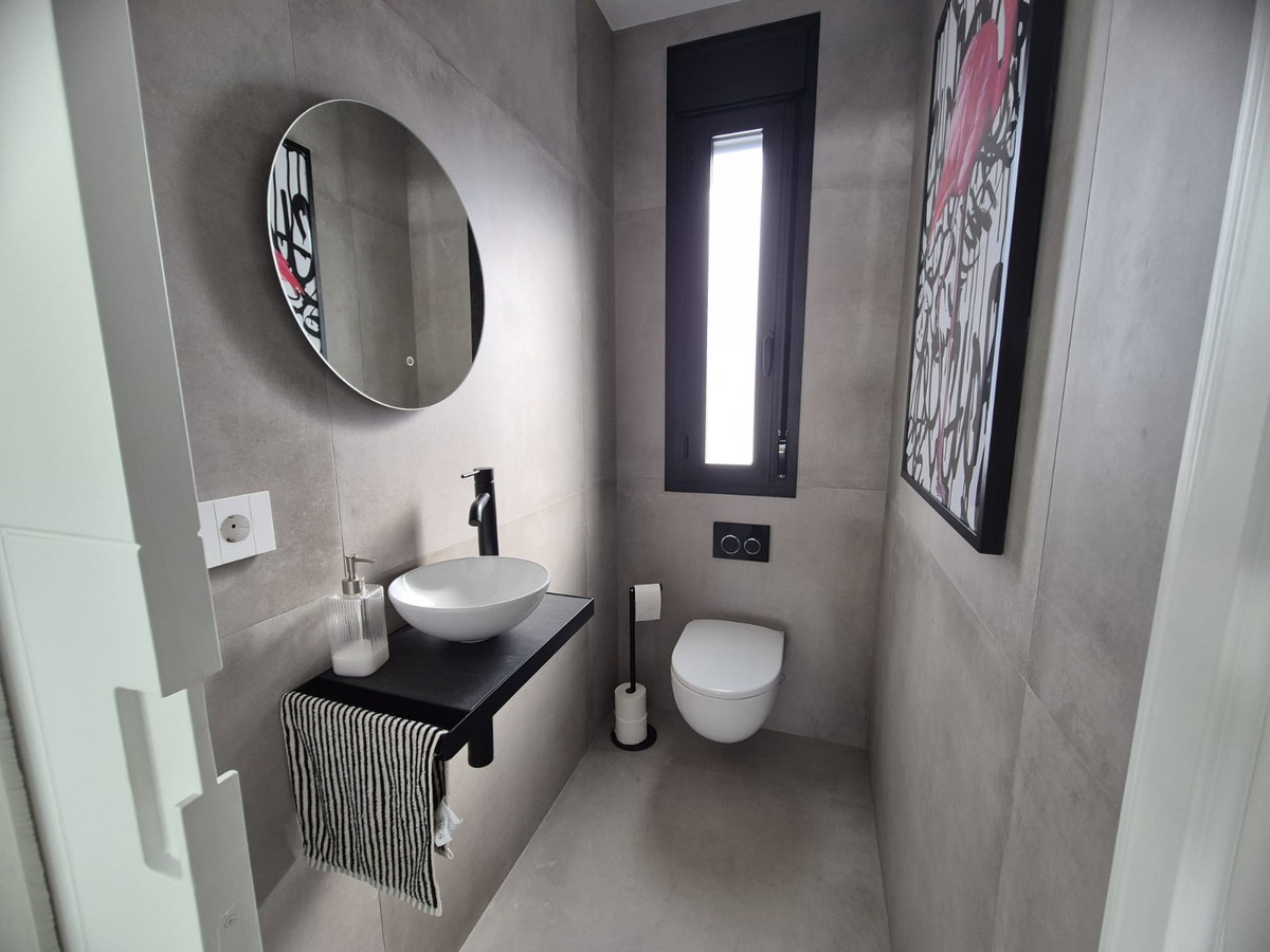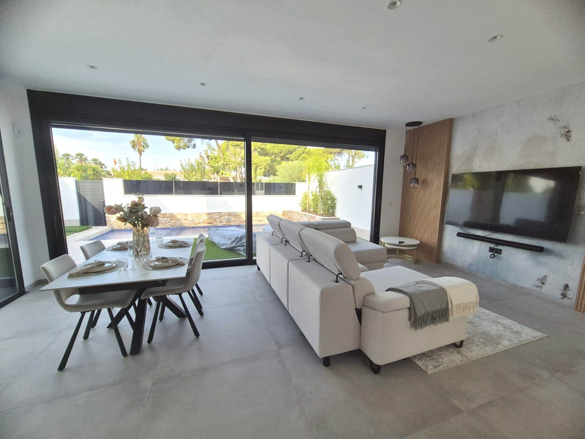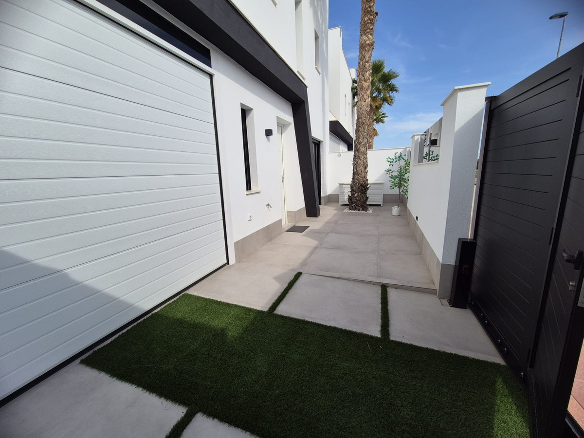 This West Facing, Three Bedroom, Semi Detached Villa in Santiago de la Ribera, is located just 750 metres from the beautiful 4km stretch of beach, lined with a fantastic variety of café bars and restaurants. Originally a charming fishing village, this area now offers a wonderful blend of tradition and modern coastal living. Main chain supermarket is conveniently close by, while San Javier town and the popular Dos Mares shopping centre are only a 5–10 minute drive away. Excellent road connections via the AP-7 and N-332 make travelling along the Costa Blanca South effortless. Built in 2025, this exquisite 143m² villa offers outstanding contemporary design and comfort. The open plan living space is bright and spacious, featuring wall-to-wall glazed doors that open directly onto the garden and pool area, creating a seamless indoor–outdoor flow. A glazed door from the dining area leads to a lovely private patio. The fitted modern kitchen with central island provides an elegant and functional cooking space. On the ground floor, you will also find a cloakroom and a double bedroom with an en-suite shower room and access to a front garden terrace. The first floor comprises two additional double bedrooms, each with walk-in wardrobes and access to a spacious terrace. The master bedroom benefits from its own stylish en-suite shower room. Both shower rooms throughout the villa are beautifully designed with double sinks, walk-in showers and underfloor heating for added luxury. From the first-floor terrace, steps lead up to the impressive 48m² private solarium, partially laid with artificial grass. This fantastic space is perfect for relaxing or entertaining, complete with an outdoor kitchen area that can be enclosed, integrated outdoor speakers, and views over the municipal garden. The property includes Airzone air conditioning, mosquito blinds, two automatic awnings, and a front tiled garden with access to the garage. This is a truly exceptional modern home in a prime coastal location on the Costa Blanca South.\n