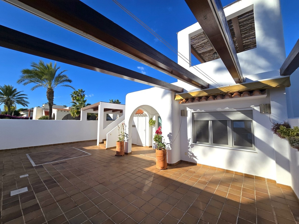 This charming semi-detached villa boasts four bedrooms, two bathrooms, a good size terraced area, wrapping around the property, and a private solarium, along with the added benefit of private parking.