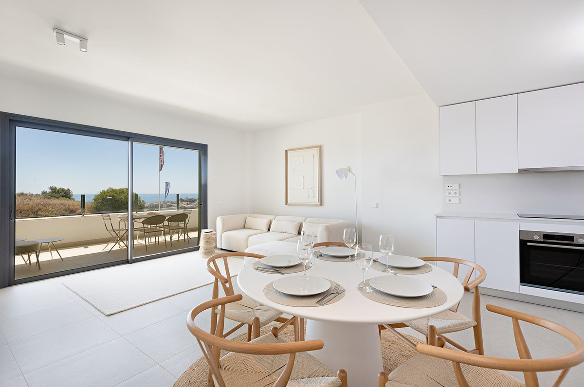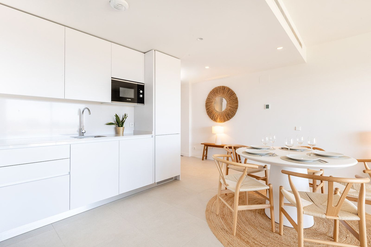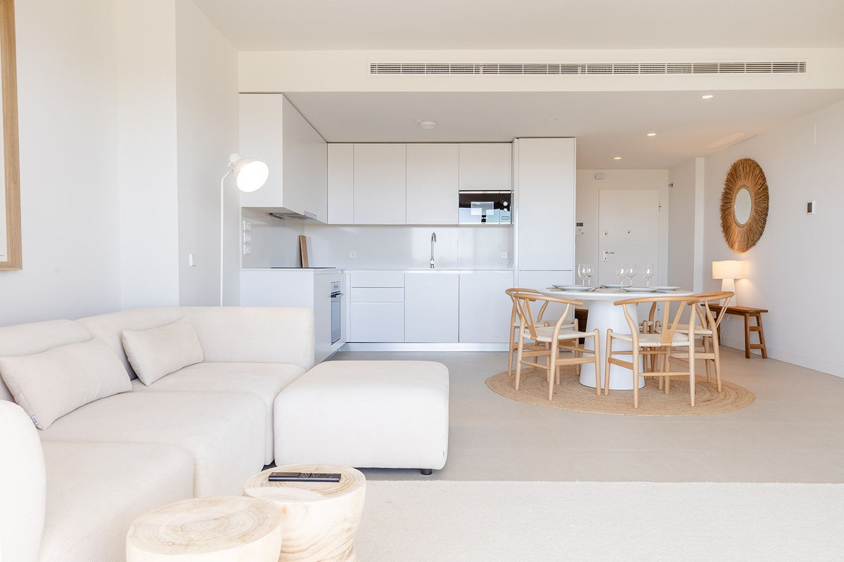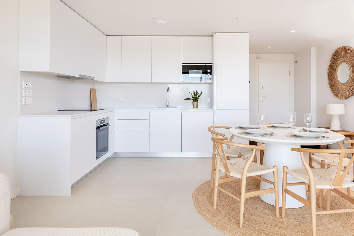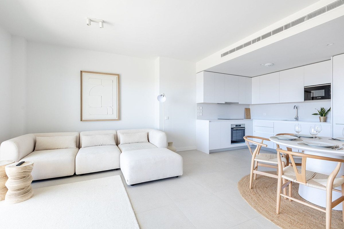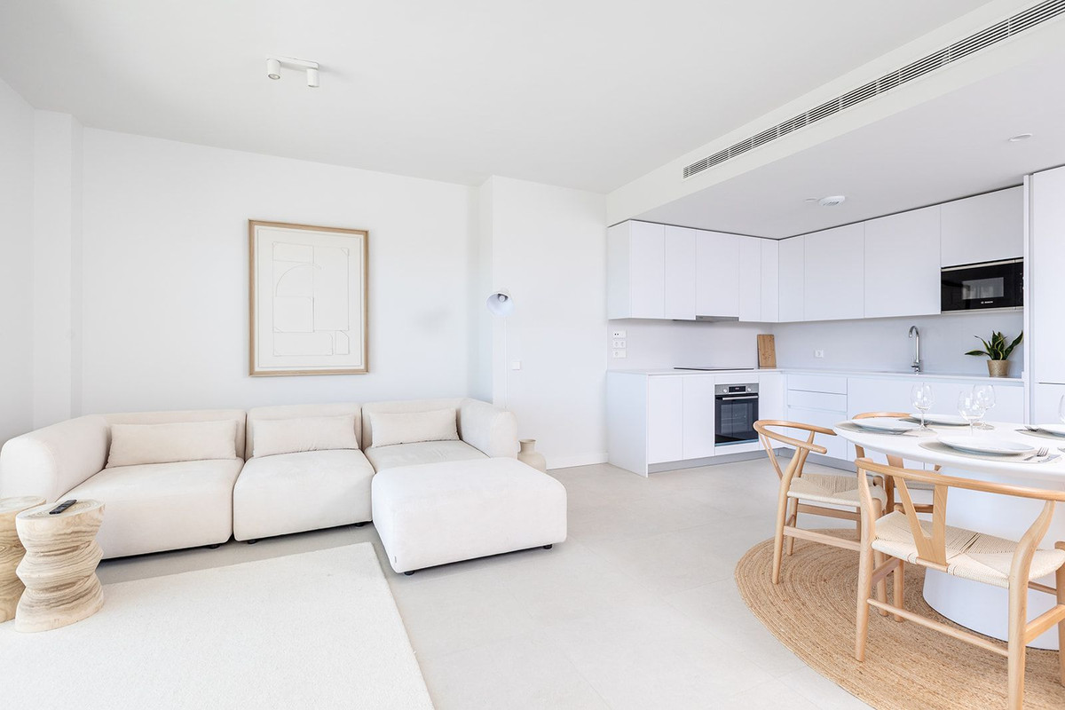 The apartment features a spacious open-plan living and dining area that opens onto a generous terrace—ideal for enjoying al fresco dining while taking in the spectacular scenery. The sleek, fully equipped kitchen includes high-end appliances and quality finishes throughout.