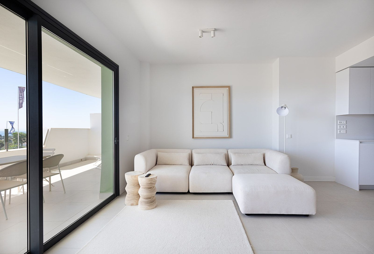 Discover luxury living in this beautifully designed 3-bedroom, 2-bathroom apartment located in the sought-after Ipanema development at Calanova Golf, Mijas. This modern home offers panoramic views of the Mediterranean Sea and the lush fairways of Calanova Golf Course, providing the perfect blend of tranquility and elegance.